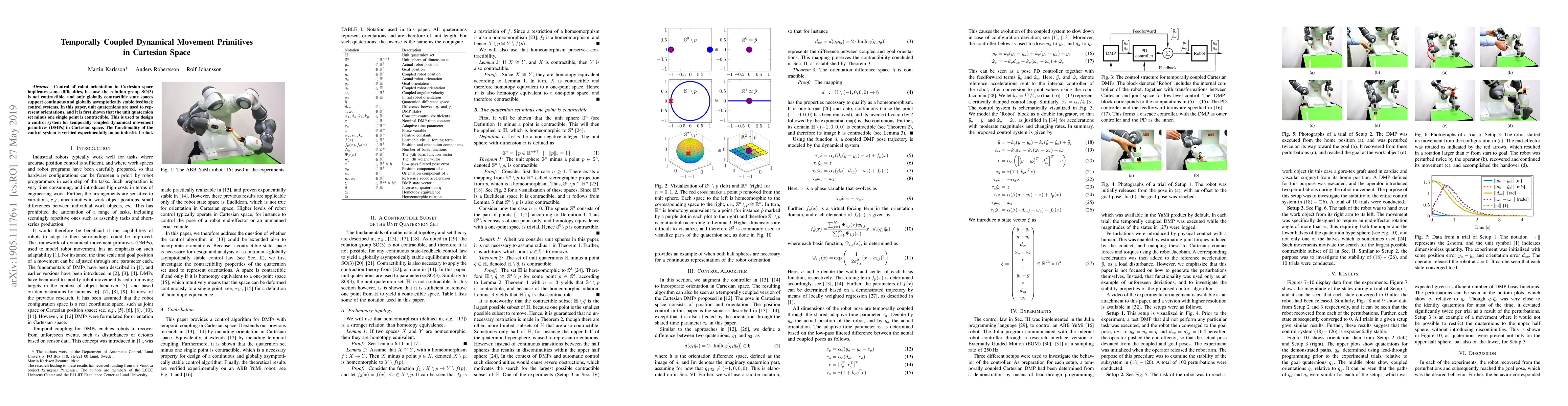 Control of robot orientation in Cartesian space implicates some difficulties, because the rotation group SO(3) is not contractible, and only globally contractible state spaces support continuous and globally asymptotically stable feedback control systems. In this paper, unit quaternions are used to represent orientations, and it is first shown that the unit quaternion set minus one single point is contractible. This is used to design a control system for temporally coupled dynamical movement primitives (DMPs) in Cartesian space. The functionality of the control system is verified experimentally on an industrial robot.