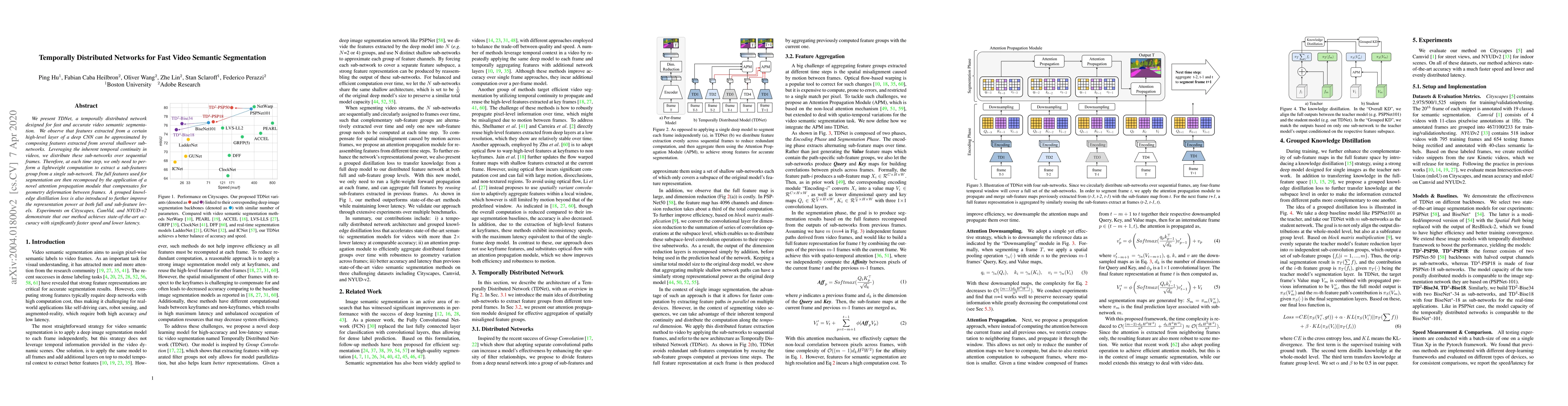TDNet is a temporally distributed network for fast video semantic segmentation, leveraging sub-networks to extract lightweight features from sequential frames and using an attention propagation module to recompose full features for accurate segmentation. The method achieves state-of-the-art accuracy with faster speed and lower latency on Cityscapes, CamVid, and NYUD-v2 datasets.