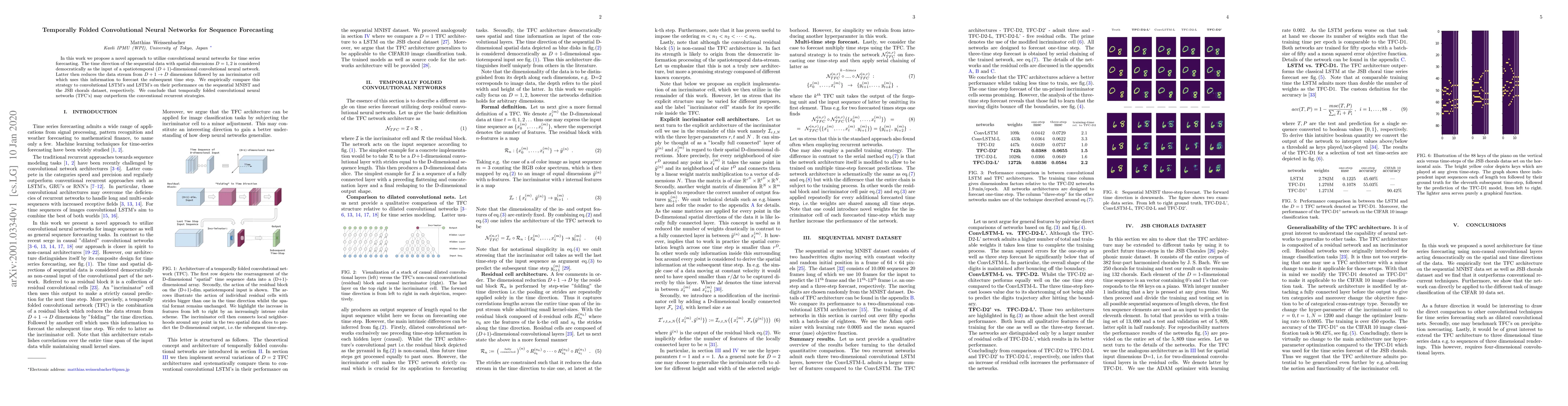 In this work we propose a novel approach to utilize convolutional neural networks for time series forecasting. The time direction of the sequential data with spatial dimensions $D=1,2$ is considered democratically as the input of a spatiotemporal $(D+1)$-dimensional convolutional neural network. Latter then reduces the data stream from $D +1 \to D$ dimensions followed by an incriminator cell which uses this information to forecast the subsequent time step. We empirically compare this strategy to convolutional LSTM's and LSTM's on their performance on the sequential MNIST and the JSB chorals dataset, respectively. We conclude that temporally folded convolutional neural networks (TFC's) may outperform the conventional recurrent strategies.