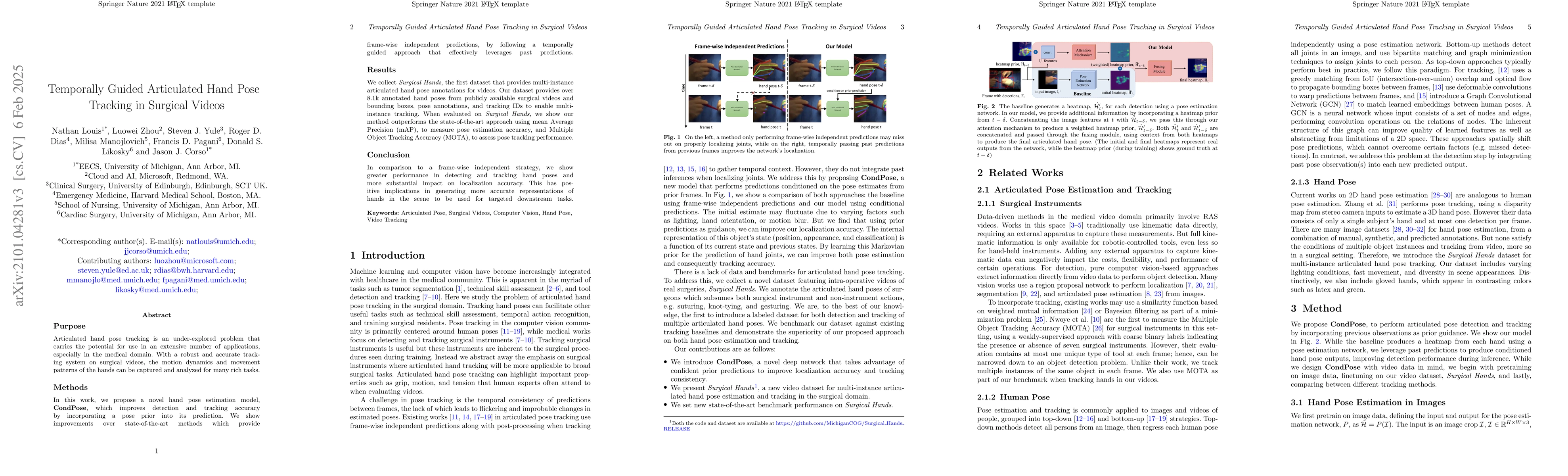 This paper proposes a novel hand pose estimation model, Res152-CondPose, that enhances articulated hand pose tracking in surgical videos by integrating temporal guidance and hand pose priors. The authors also introduce the Surgical Hands dataset for multi-instance articulated hand pose annotations, which outperforms existing methods in pose estimation and tracking accuracy.