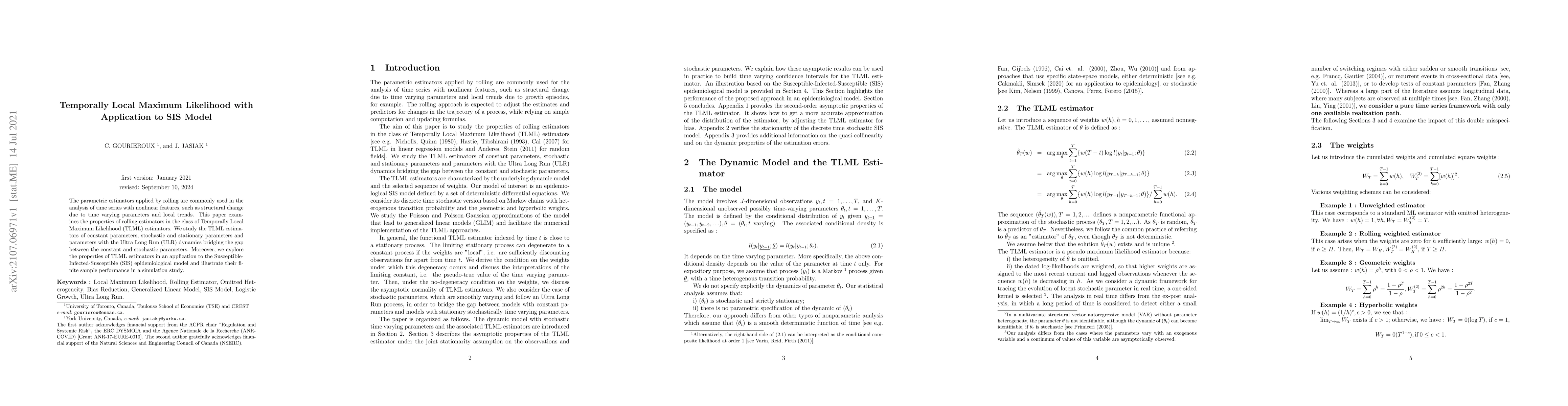The parametric estimators applied by rolling are commonly used in the analysis of time series with nonlinear features, such as structural change due to time varying parameters and local trends. This paper examines the properties of rolling estimators in the class of Temporally Local Maximum Likelihood (TLML) estimators. We study the TLML estimators of constant parameters, stochastic and stationary parameters and parameters with the Ultra Long Run (ULR) dynamics bridging the gap between the constant and stochastic parameters. Moreover, we explore the properties of TLML estimators in an application to the Susceptible-Infected-Susceptible (SIS) epidemiological model and illustrate their finite sample performance in a simulation study.