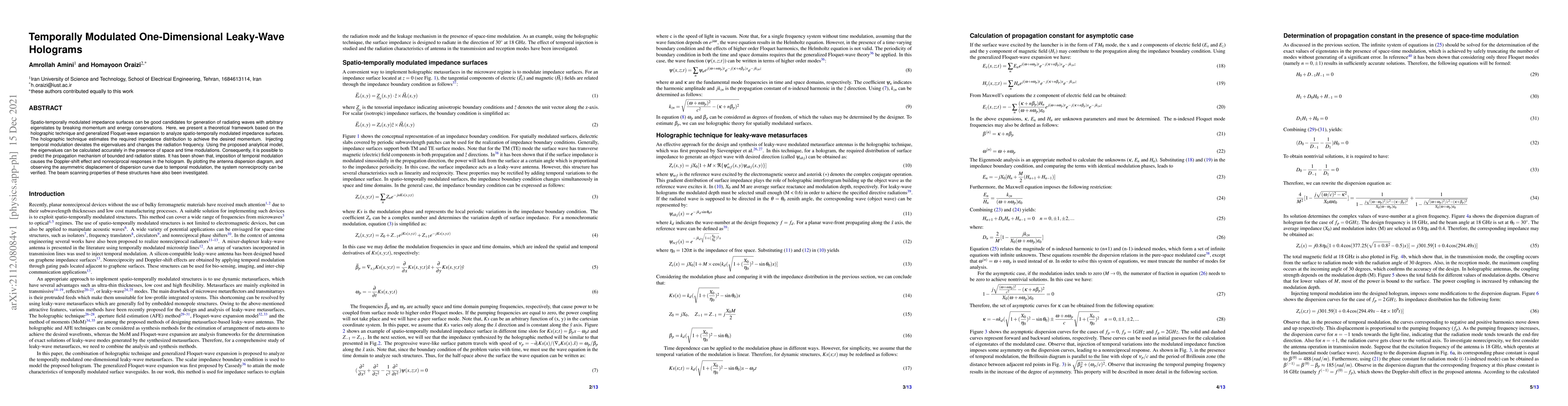 Spatio-temporally modulated impedance surfaces can be good candidates for generation of radiating waves with arbitrary eigenstates by breaking momentum and energy conservations. Here, we present a theoretical framework based on the holographic technique and generalized Floquet-wave expansion to analyze spatio-temporally modulated impedance surfaces. The holographic technique estimates the required impedance distribution to achieve the desired momentum. Injecting temporal modulation deviates the eigenvalues and changes the radiation frequency. Using the proposed analytical model, the eigenvalues can be calculated accurately in the presence of space and time modulations. Consequently, it is possible to predict the propagation mechanism of bounded and radiation states. It has been shown that, imposition of temporal modulation causes the Doppler-shift effect and nonreciprocal responses in the hologram. By plotting the antenna dispersion diagram, and observing the asymmetric displacement of dispersion curve due to temporal modulation, the system nonreciprocity can be verified. The beam scanning properties of these structures have also been investigated