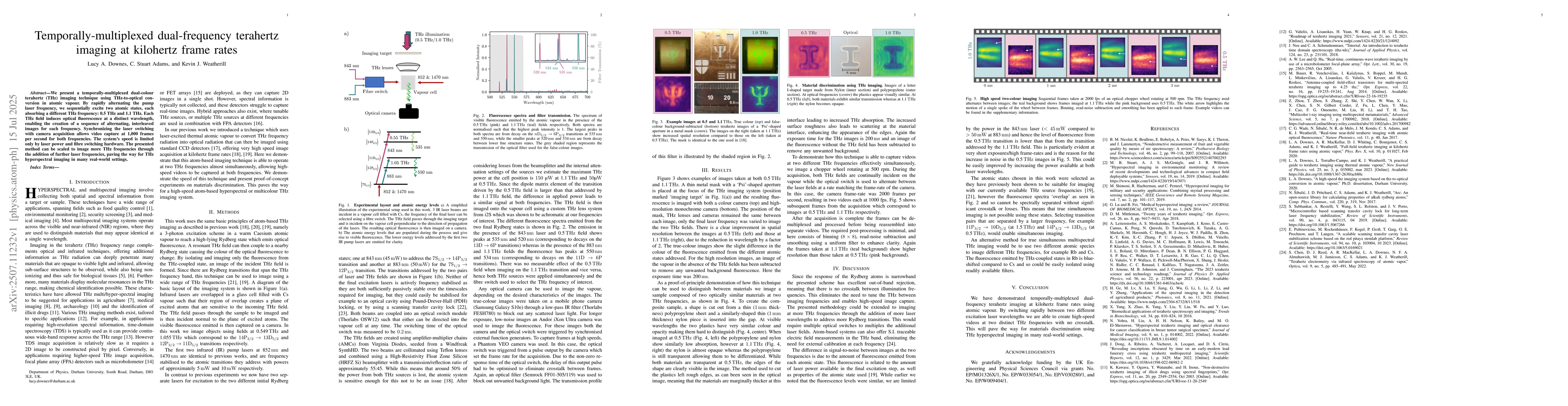 We present a temporally-multiplexed dual-colour terahertz (THz) imaging technique using THz-to-optical conversion in atomic vapour. By rapidly alternating the pump laser frequency, we sequentially excite two atomic states, each absorbing a different THz frequency: 0.5 THz and 1.1 THz. Each THz field induces optical fluorescence at a distinct wavelength, enabling the creation of a sequence of alternating, interleaved images for each frequency. Synchronizing the laser switching with camera acquisition allows video capture at 1,000 frames per second for both frequencies. The system's speed is limited only by laser power and fibre switching hardware. The presented method can be scaled to image more THz frequencies through the addition of further laser frequencies, paving the way for THz hyperspectral imaging in many real-world settings.
