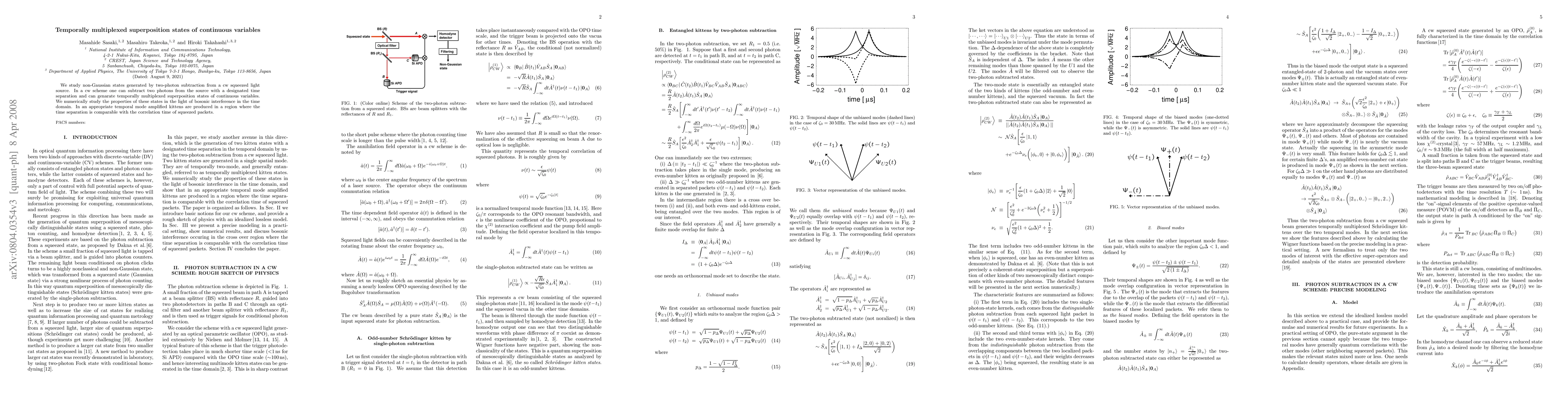 We study non-Gaussian states generated by two-photon subtraction from a cw squeezed light source. In a cw scheme one can subtract two photons from the source with a designated time separation and can genarate temporally multiplexed superposition states of continuous variables. We numerically study the properties of these states in the light of bosonic interference in the time domain. In an appropriate temporal mode amplified kittens are produced in a region where the time separation is comparable with the correlation time of squeezed packets.