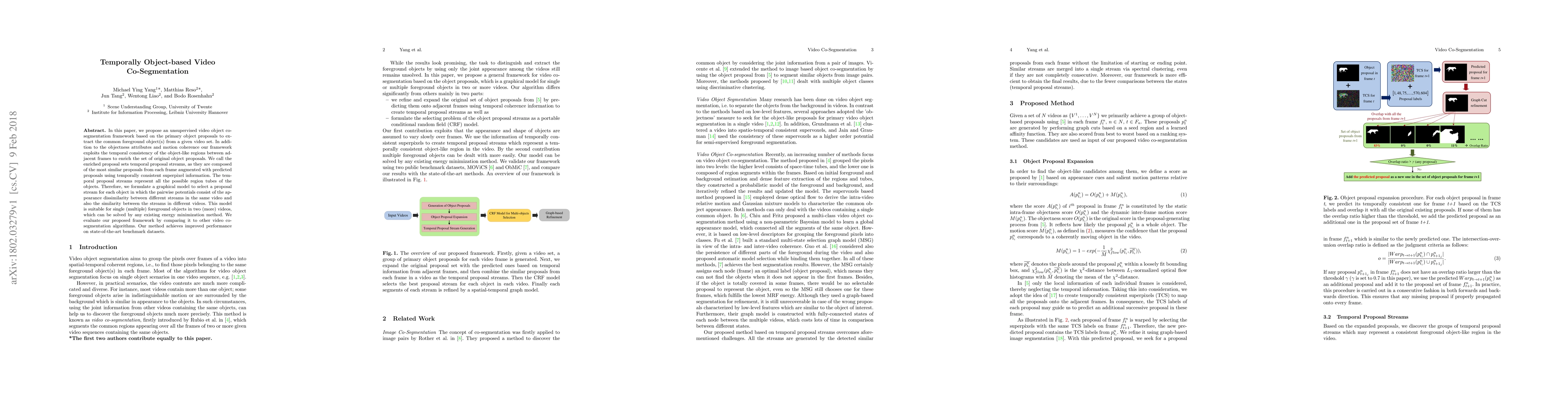 The paper proposes an unsupervised video object co-segmentation framework that uses primary object proposals to extract common foreground objects from a video set. It exploits objectness attributes, motion coherence, and temporal consistency of object-like regions between adjacent frames to enrich the set of original object proposals, called temporal proposal streams. A graphical model is formulated to select a proposal stream for each object based on appearance dissimilarity within the same video and similarity between streams in different videos.