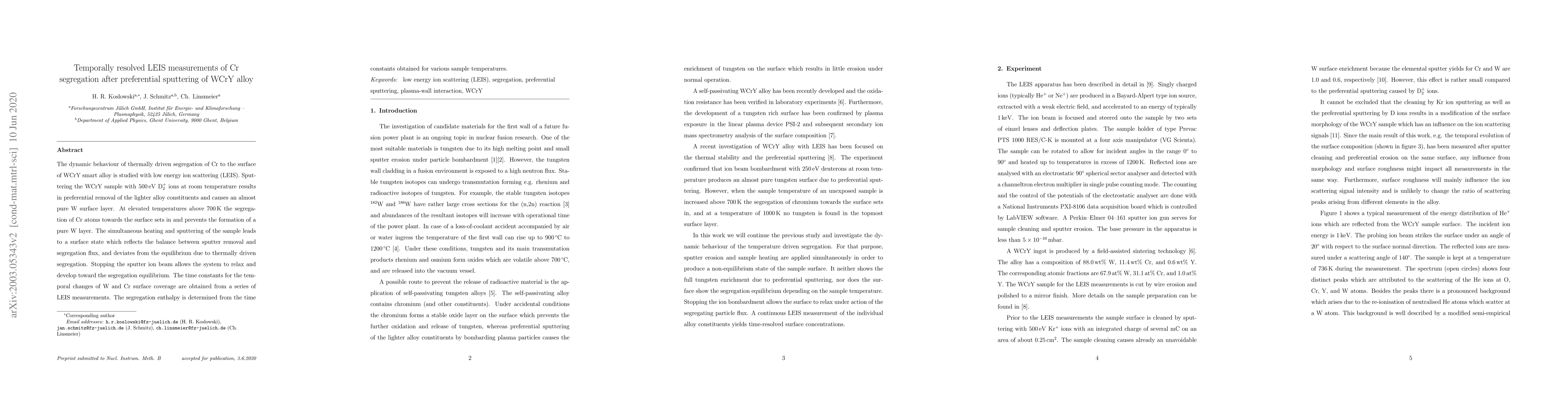This study investigates the thermally driven segregation of Cr in WCrY alloy using low energy ion scattering (LEIS) after preferential sputtering, revealing the temporal dynamics of Cr atoms reaching the surface and the segregation enthalpy at different temperatures. The results show that Cr segregation occurs above 700 K, balancing with sputter removal and deviating from equilibrium.