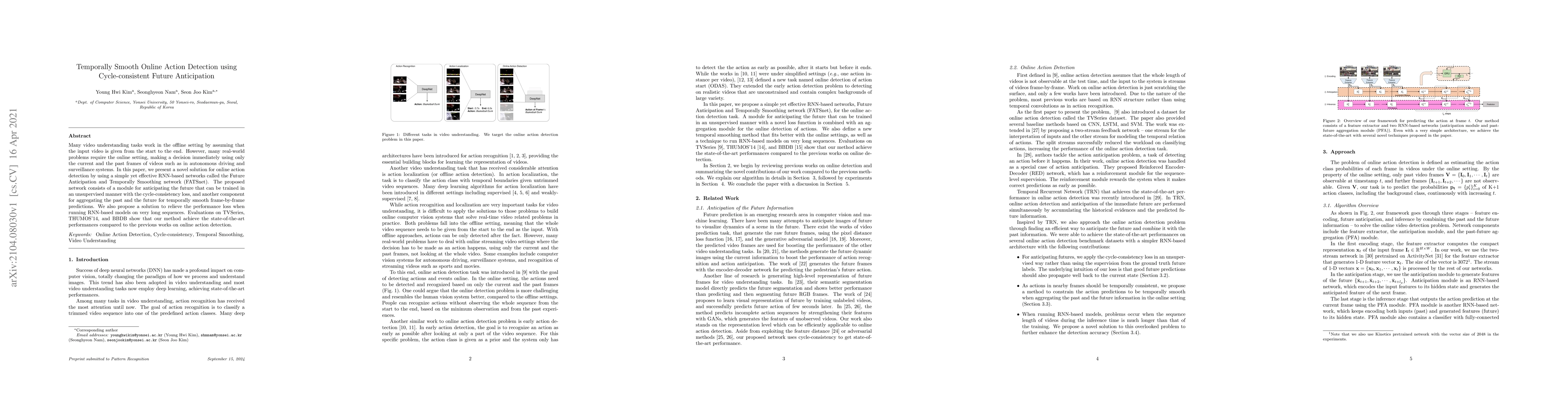 This paper introduces FATSnet, an RNN-based network for online action detection, utilizing a future anticipation module and temporal smoothing to achieve state-of-the-art performance on datasets like TVSeries, THUMOS14, and BBDB. The method employs cycle-consistency loss for unsupervised training and addresses performance issues with long sequences.