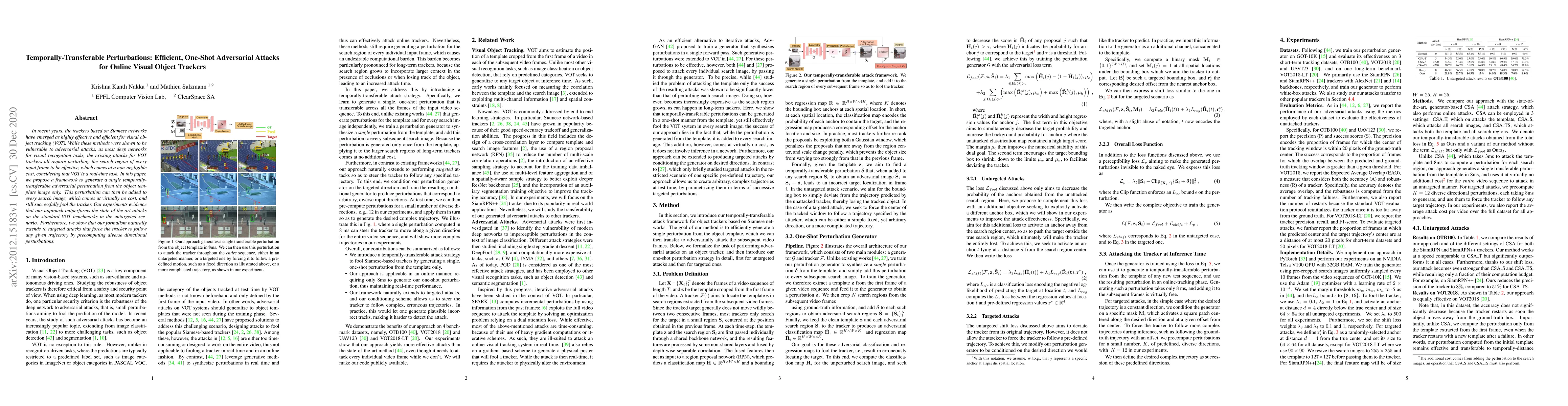 This paper presents a novel framework for generating a single, temporally-transferable adversarial perturbation from an object template image, which can be added to each search image with minimal computational cost to fool online visual object trackers. The proposed method outperforms existing state-of-the-art attacks and extends to targeted attacks by precomputing directional perturbations.