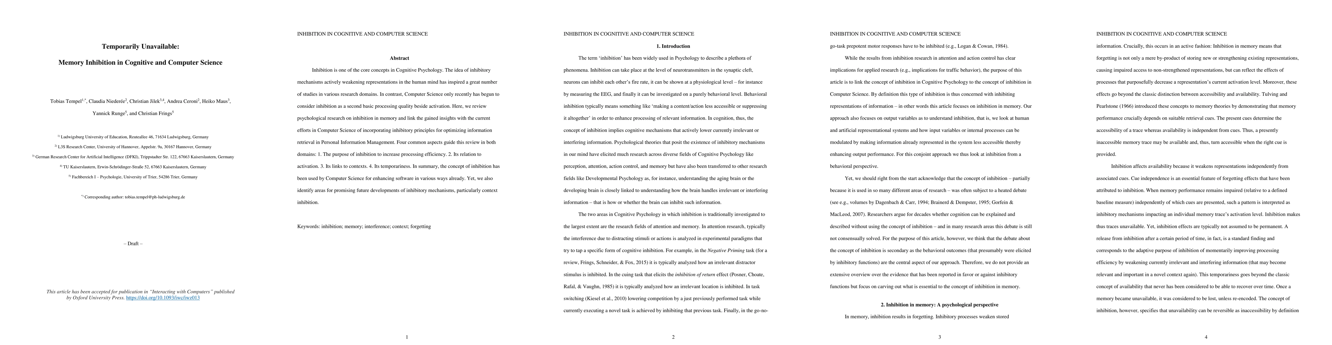 This paper reviews cognitive psychology research on memory inhibition and connects these insights with recent Computer Science efforts to incorporate inhibitory principles for optimizing information retrieval. It highlights four guiding aspects: inhibition's purpose, its relation to activation, its contextual links, and its temporariness, suggesting potential future developments in context inhibition for software enhancement.