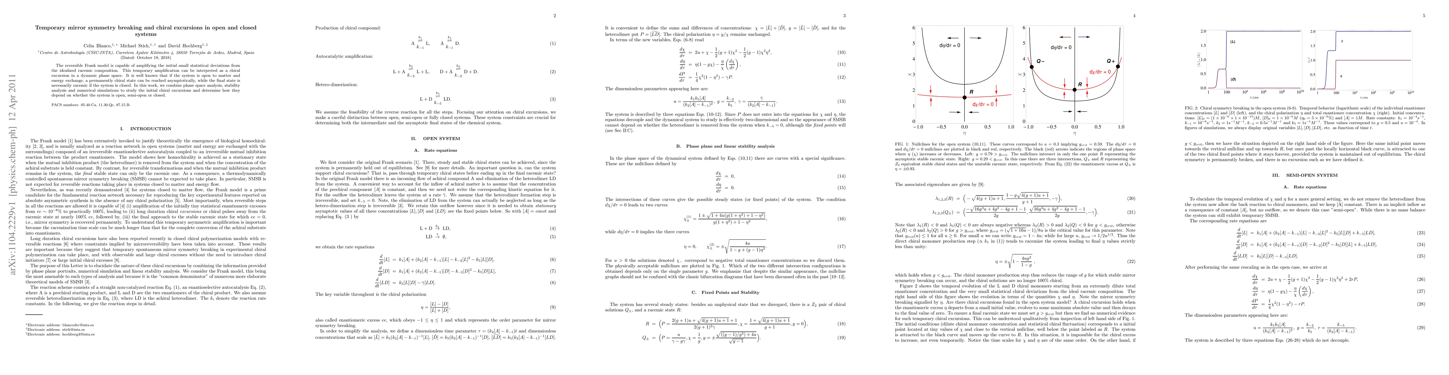 The reversible Frank model is capable of amplifying the initial small statistical deviations from the idealized racemic composition. This temporary amplification can be interpreted as a chiral excursion in a dynamic phase space. It is well known that if the system is open to matter and energy exchange, a permanently chiral state can be reached asymptotically, while the final state is necessarily racemic if the system is closed. In this work, we combine phase space analysis, stability analysis and numerical simulations to study the initial chiral excursions and determine how they depend on whether the system is open, semi-open or closed.