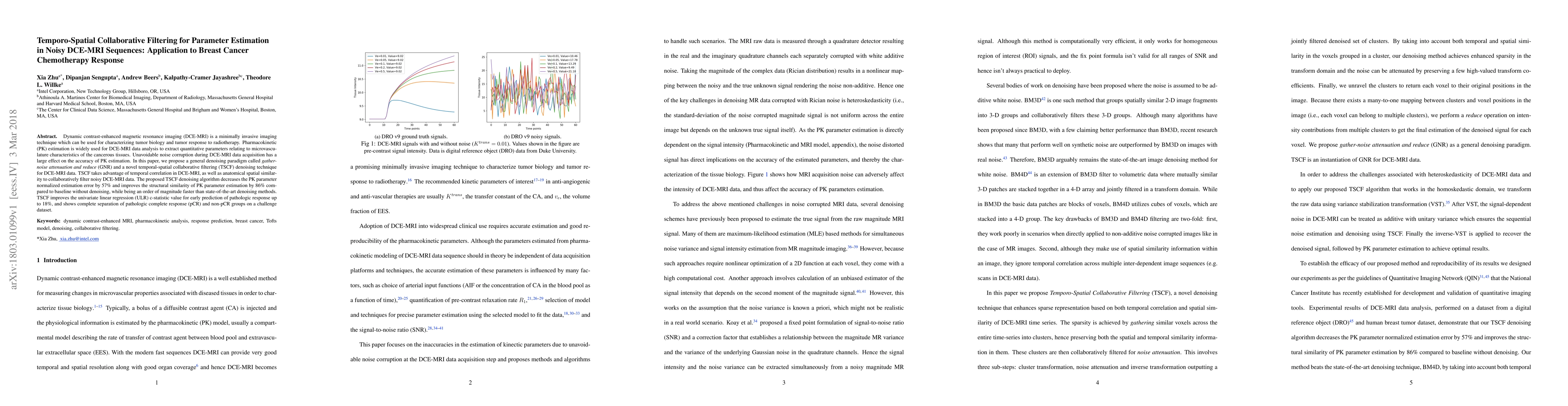 Dynamic contrast-enhanced magnetic resonance imaging (DCE-MRI) is a minimally invasive imaging technique which can be used for characterizing tumor biology and tumor response to radiotherapy. Pharmacokinetic (PK) estimation is widely used for DCE-MRI data analysis to extract quantitative parameters relating to microvascu- lature characteristics of the cancerous tissues. Unavoidable noise corruption during DCE-MRI data acquisition has a large effect on the accuracy of PK estimation. In this paper, we propose a general denoising paradigm called gather- noise attenuation and reduce (GNR) and a novel temporal-spatial collaborative filtering (TSCF) denoising technique for DCE-MRI data. TSCF takes advantage of temporal correlation in DCE-MRI, as well as anatomical spatial similar- ity to collaboratively filter noisy DCE-MRI data. The proposed TSCF denoising algorithm decreases the PK parameter normalized estimation error by 57% and improves the structural similarity of PK parameter estimation by 86% com- pared to baseline without denoising, while being an order of magnitude faster than state-of-the-art denoising methods. TSCF improves the univariate linear regression (ULR) c-statistic value for early prediction of pathologic response up to 18%, and shows complete separation of pathologic complete response (pCR) and non-pCR groups on a challenge dataset.