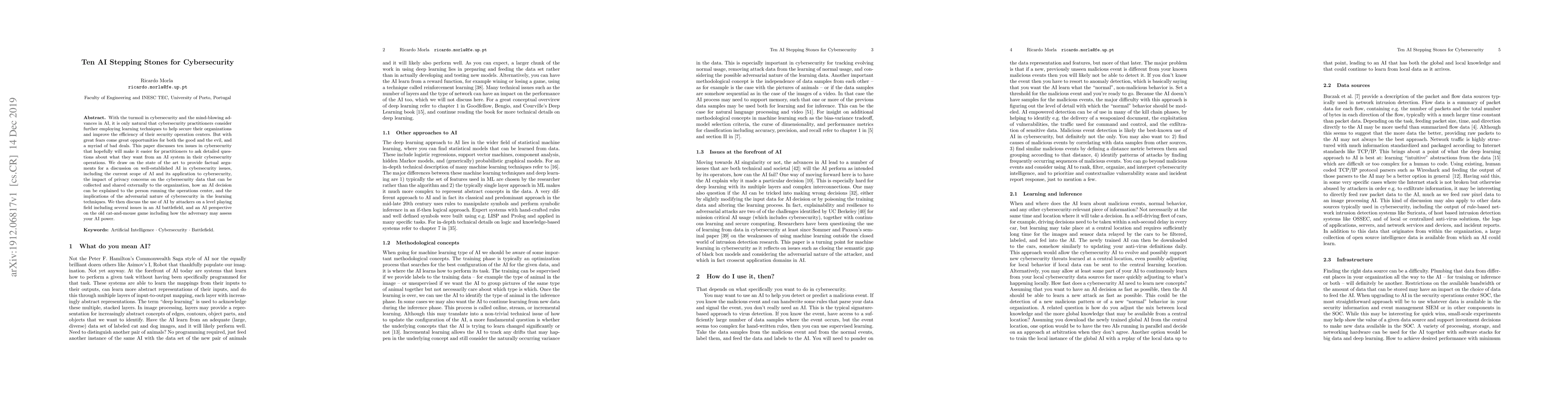 This paper outlines ten critical issues in integrating AI into cybersecurity operations, emphasizing the potential benefits and challenges, including privacy concerns, explainability of AI decisions, and the adversarial nature of cybersecurity. It also discusses how AI can be misused by attackers.