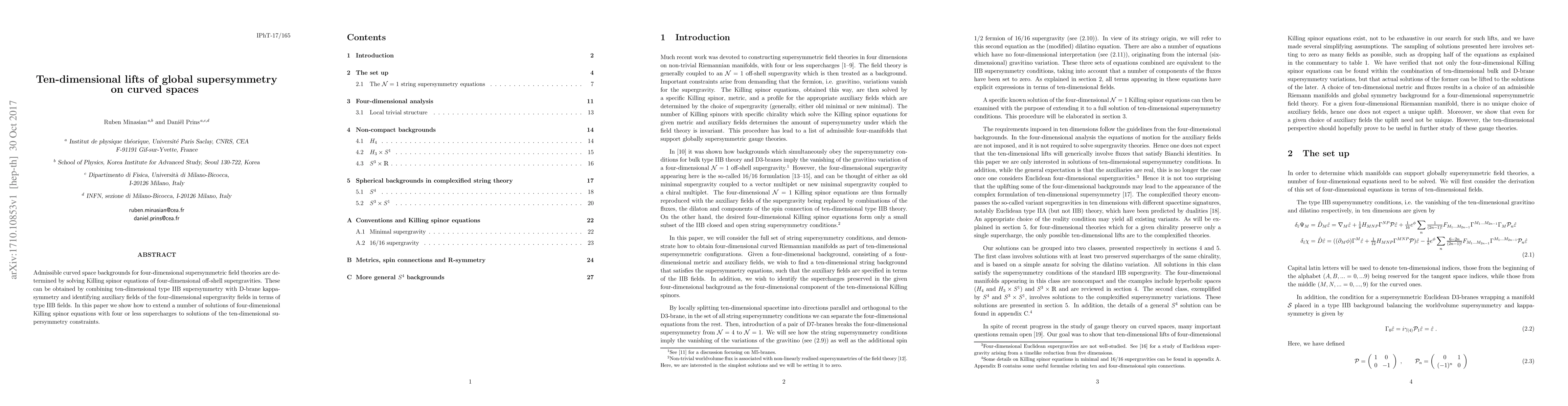 This paper investigates how solutions to four-dimensional Killing spinor equations, derived from four-dimensional off-shell supergravities, can be extended to ten-dimensional supersymmetry by leveraging type IIB supersymmetry and D-brane kappa-symmetry. It demonstrates the method for lifting such solutions from four to ten dimensions.