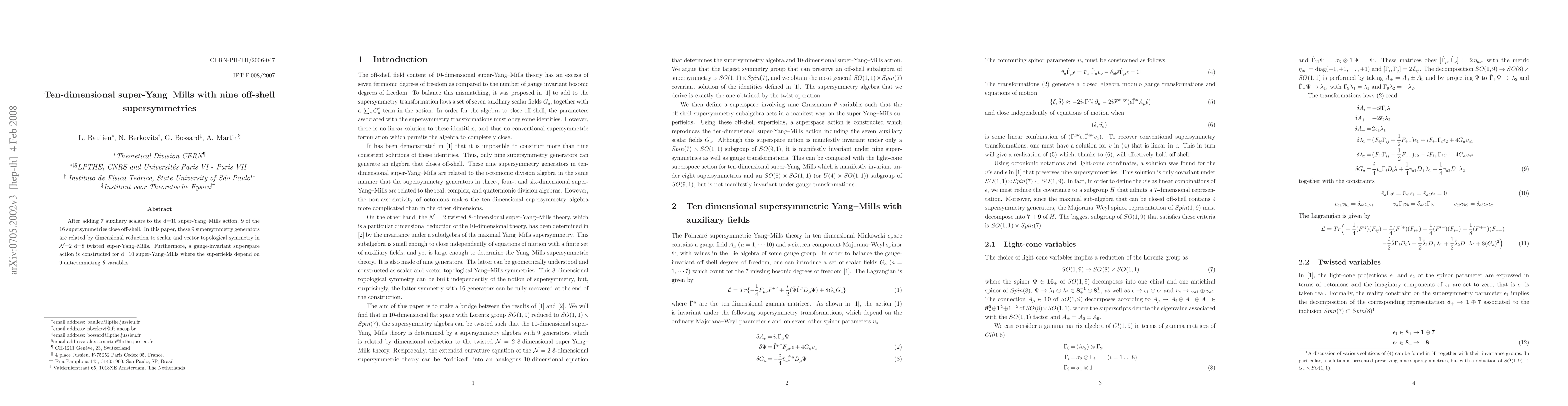 This paper explores a d=10 super-Yang-Mills theory augmented by 7 auxiliary scalars, showing that 9 out of 16 supersymmetry generators close off-shell. It establishes a dimensional reduction linking these 9 symmetries to scalar and vector topological symmetries in $\N$=2 d=8 twisted super-Yang-Mills, and constructs a gauge-invariant superspace action dependent on 9 anticommuting theta variables.