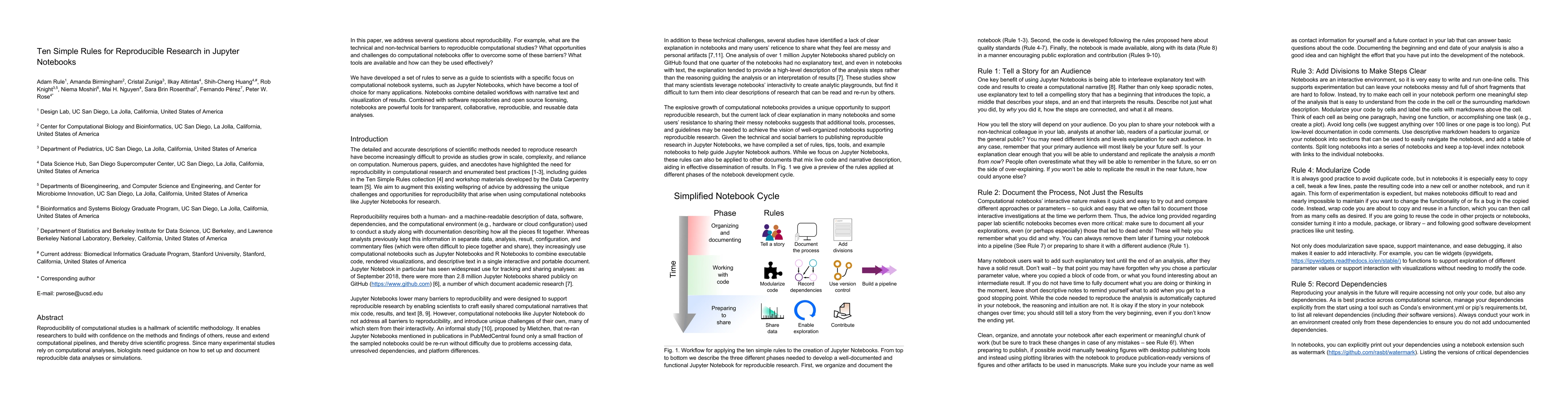 This paper outlines ten simple rules to enhance reproducibility in computational studies using Jupyter Notebooks, addressing technical and non-technical barriers, and providing guidance on utilizing available tools for transparent, collaborative, and reproducible data analysis.