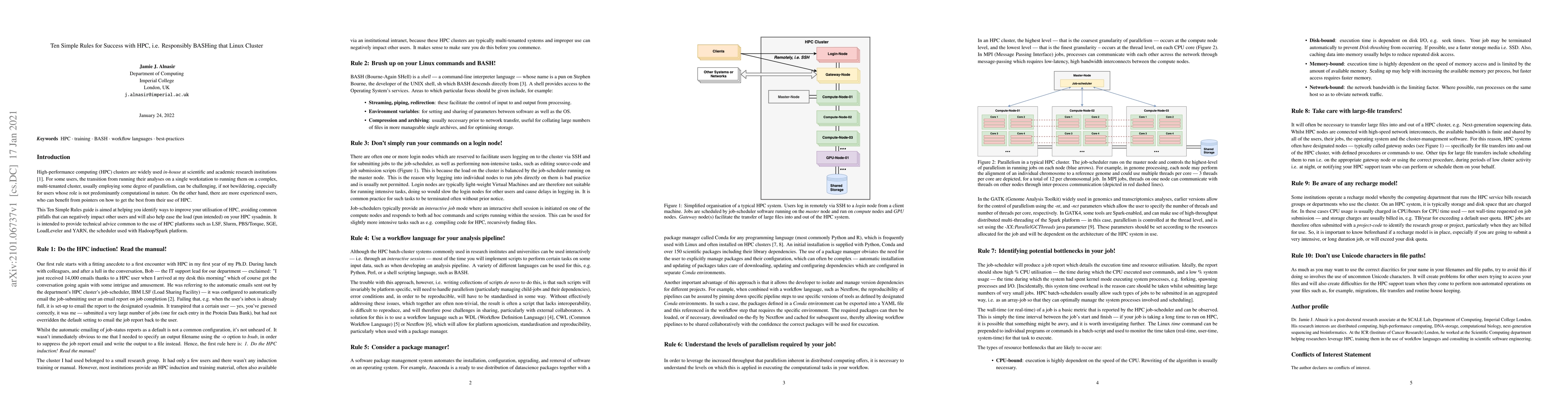 High-performance computing (HPC) clusters are widely used in-house at scientific and academic research institutions. For some users, the transition from running their analyses on a single workstation to running them on a complex, multi-tenanted cluster, usually employing some degree of parallelism, can be challenging, if not bewildering, especially for users whose role is not predominantly computational in nature. On the other hand, there are more experienced users, who can benefit from pointers on how to get the best from their use of HPC. This Ten Simple Rules guide is aimed at helping you identify ways to improve your utilisation of HPC, avoiding common pitfalls that can negatively impact other users and will also help ease the load (pun intended) on your HPC sysadmin. It is intended to provide technical advice common to the use of HPC platforms such as LSF, Slurm, PBS/Torque, SGE, LoadLeveler and YARN, the scheduler used with Hadoop/Spark platform.