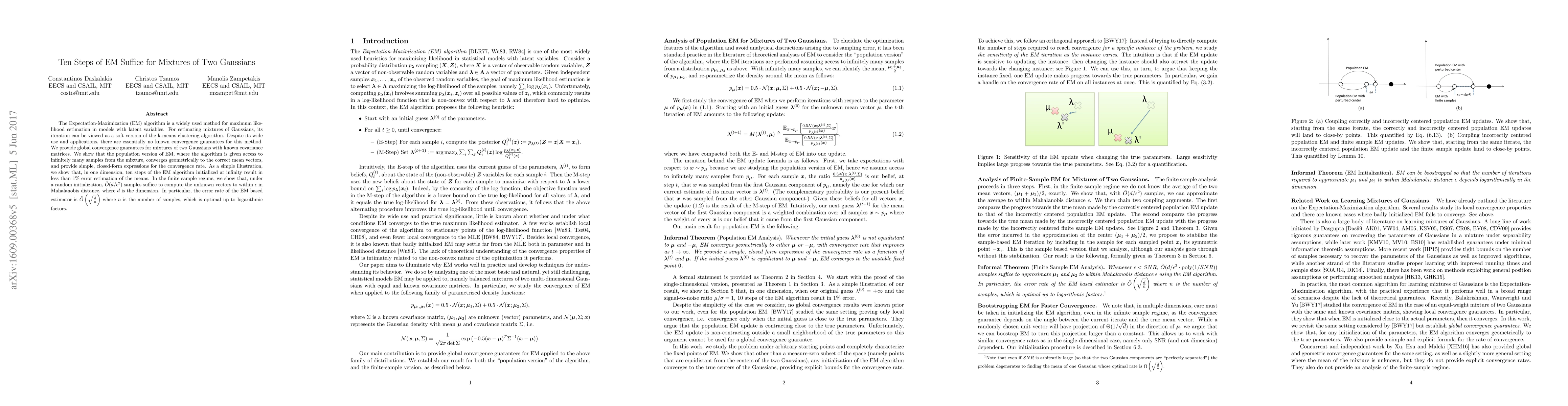 This paper provides global convergence guarantees for the Expectation-Maximization (EM) algorithm applied to mixtures of two Gaussians with known covariance matrices. It demonstrates that ten steps of EM initialized far from the true means result in less than 1% error in one dimension.