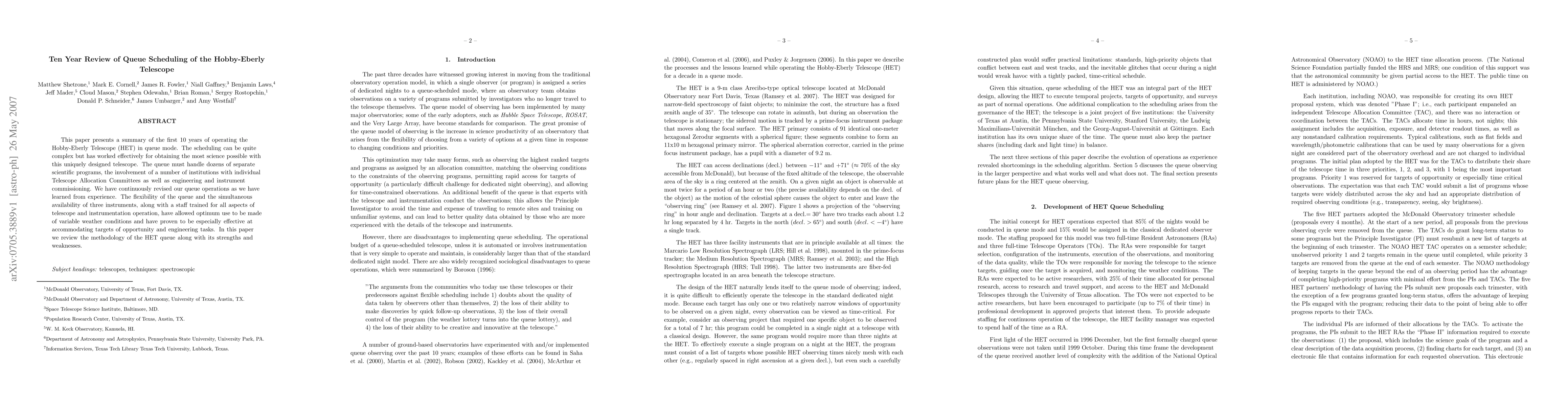 This paper presents a summary of the first 10 years of operating the Hobby-Eberly Telescope (HET) in queue mode. The scheduling can be quite complex but has worked effectively for obtaining the most science possible with this uniquely designed telescope. The queue must handle dozens of separate scientific programs, the involvement of a number of institutions with individual Telescope Allocation Committees as well as engineering and instrument commissioning. We have continuously revised our queue operations as we have learned from experience. The flexibility of the queue and the simultaneous availability of three instruments, along with a staff trained for all aspects of telescope and instrumentation operation, have allowed optimum use to be made of variable weather conditions and have proven to be especially effective at accommodating targets of opportunity and engineering tasks. In this paper we review the methodology of the HET queue along with its strengths and weaknesses.