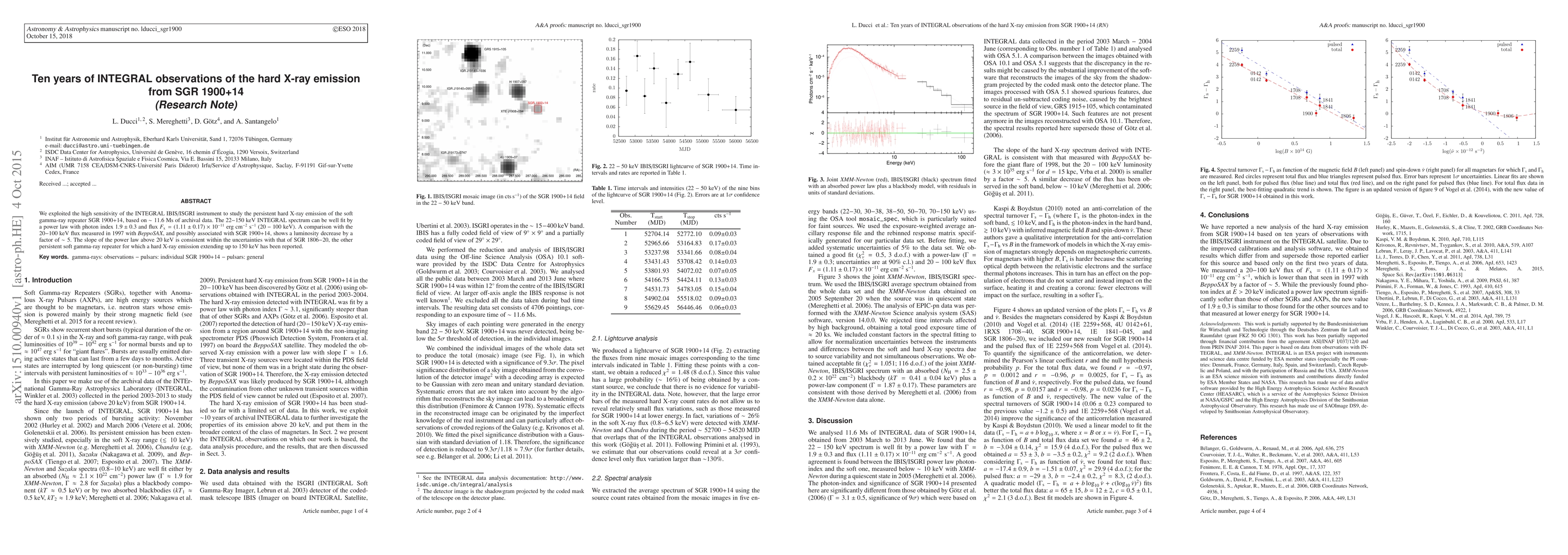 This paper analyzes ten years of INTEGRAL observations of the persistent hard X-ray emission from SGR 1900+14, revealing a power-law spectrum with a photon index of 1.9 +/- 0.3 and a significant decrease in luminosity since 1997. The findings suggest a consistent spectral slope with another soft gamma-ray repeater, SGR 1806-20.