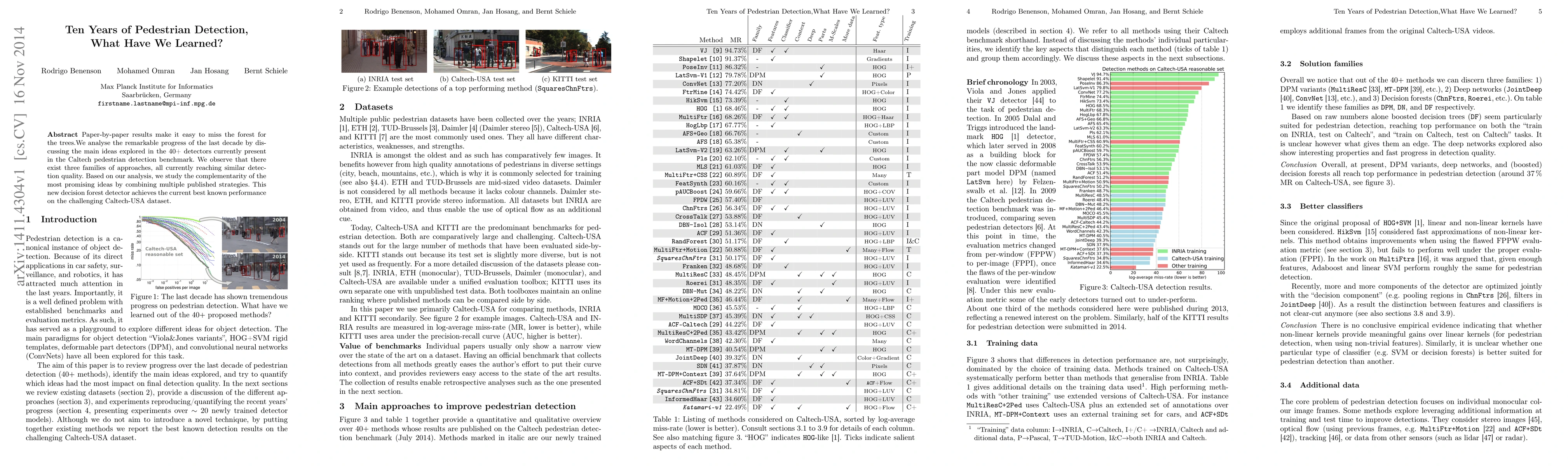 The paper analyzes the progress in pedestrian detection over the last decade, identifying three main families of approaches. A novel 'decision forest detector' is proposed, combining successful strategies from these families, achieving top performance on the Caltech-USA dataset.