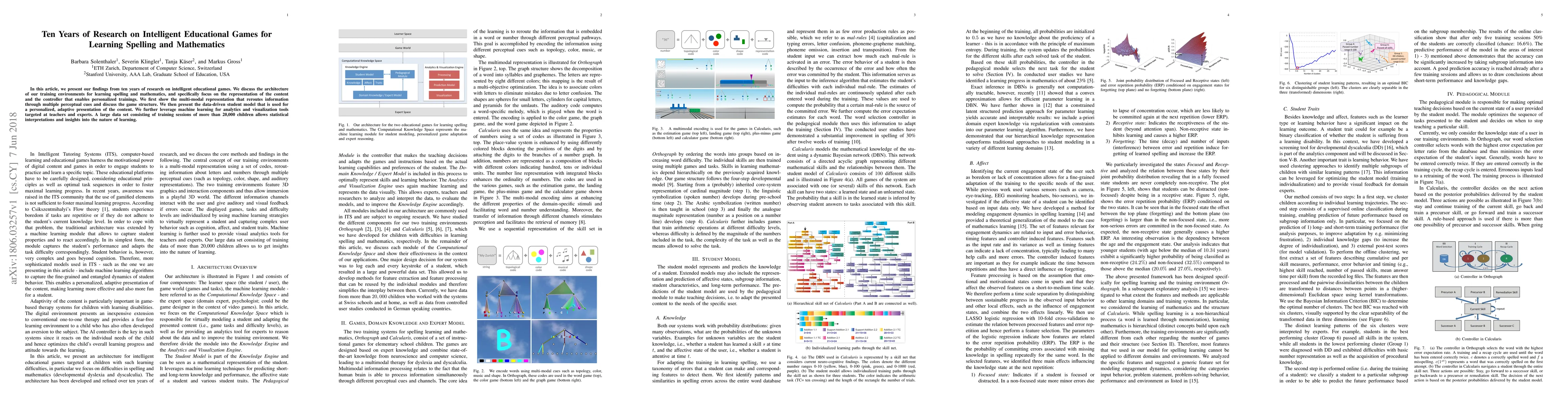 This paper summarizes ten years of research on intelligent educational games for spelling and mathematics, focusing on multi-modal content representation and adaptive training environments. It also highlights the use of machine learning for personalized student models and analytics, supported by a large dataset of over 20,000 children's training sessions.