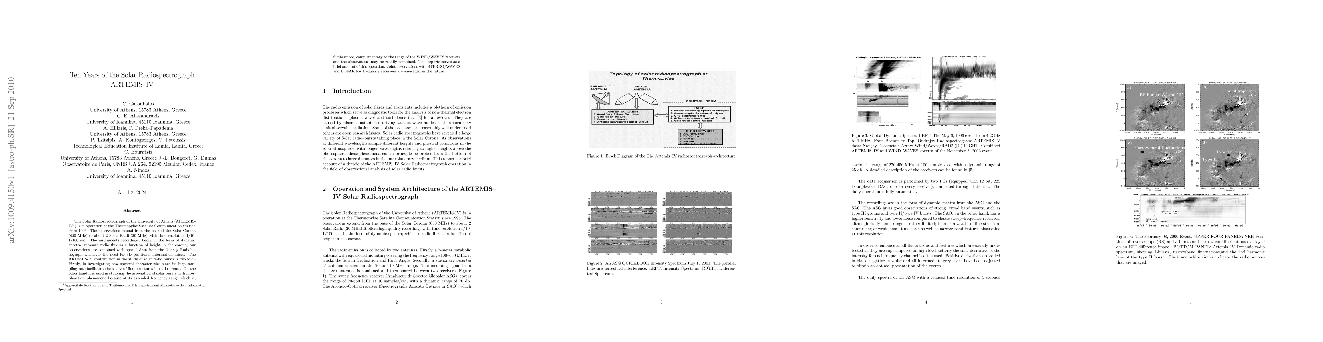 The Solar Radiospectrograph ARTEMIS-IV, operational since 1996, provides dynamic spectra from 650 MHz to 20 MHz, aiding in the study of solar radio bursts and their interplanetary associations. Future collaborations with STEREO/WAVES and LOFAR are planned.