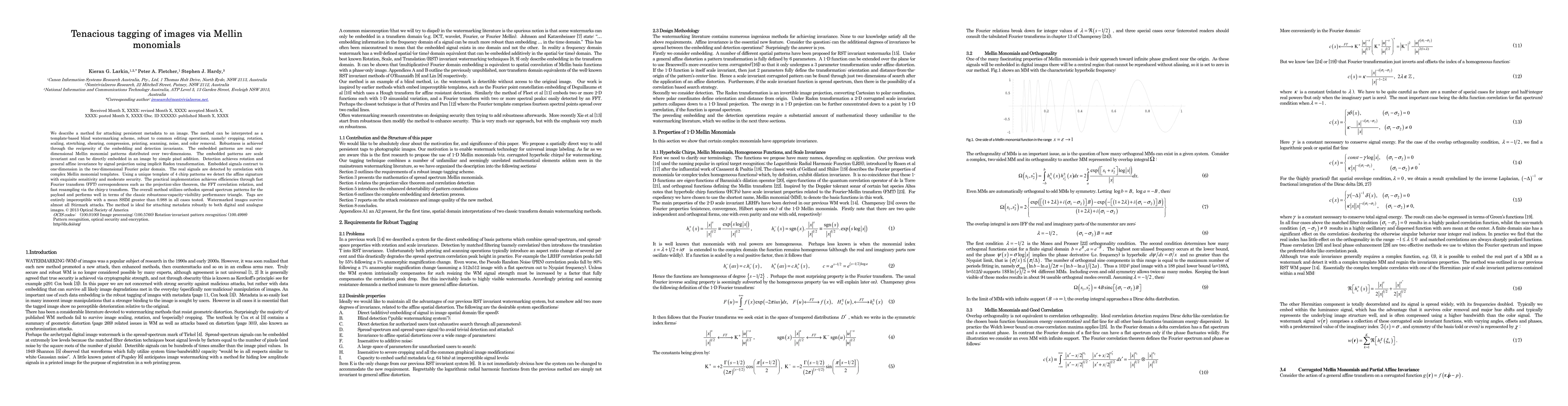 We describe a method for attaching persistent metadata to an image. The method can be interpreted as a template-based blind watermarking scheme, robust to common editing operations, namely: cropping, rotation, scaling, stretching, shearing, compression, printing, scanning, noise, and color removal. Robustness is achieved through the reciprocity of the embedding and detection invariants. The embedded patterns are real onedimensional Mellin monomial patterns distributed over two-dimensions. The embedded patterns are scale invariant and can be directly embedded in an image by simple pixel addition. Detection achieves rotation and general affine invariance by signal projection using implicit Radon transformation. Embedded signals contract to one-dimension in the two-dimensional Fourier polar domain. The real signals are detected by correlation with complex Mellin monomial templates. Using a unique template of 4 chirp patterns we detect the affine signature with exquisite sensitivity and moderate security. The practical implementation achieves efficiencies through fast Fourier transform (FFT) correspondences such as the projection-slice theorem, the FFT correlation relation, and fast resampling via the chirp-z transform. The overall method utilizes orthodox spread spectrum patterns for the payload and performs well in terms of the classic robustness-capacity-visibility performance triangle. Tags are entirely imperceptible with a mean SSIM greater than 0.988 in all cases tested. Watermarked images survive almost all Stirmark attacks. The method is ideal for attaching metadata robustly to both digital and analogue images.