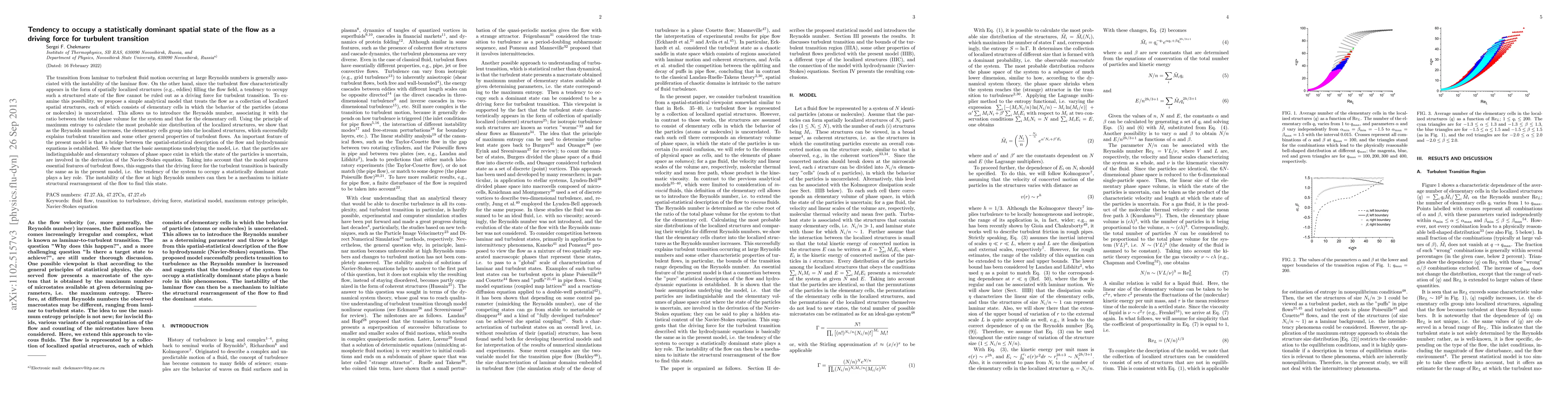 The transition from laminar to turbulent fluid motion occurring at large Reynolds numbers is generally associated with the instability of the laminar flow. On the other hand, since the turbulent flow characteristically appears in the form of spatially localized structures (e.g., eddies) filling the flow field, a tendency to occupy such a structured state of the flow cannot be ruled out as a driving force for turbulent transition. To examine this possibility, we propose a simple analytical model that treats the flow as a collection of localized spatial structures, each of which consists of elementary cells in which the behavior of the particles (atoms or molecules) is uncorrelated. This allows us to introduce the Reynolds number, associating it with the ratio between the total phase volume for the system and that for the elementary cell. Using the principle of maximum entropy to calculate the most probable size distribution of the localized structures, we show that as the Reynolds number increases, the elementary cells group into the localized structures, which successfully explains turbulent transition and some other general properties of turbulent flows. We show that the basic assumptions underlying the model, i.e. that the particles are indistinguishable and elementary volumes of phase space exist in which the state of the particles is uncertain, are involved in the derivation of the Navier-Stokes equation. Taking into account that the model captures essential features of turbulent flows, this suggests that the driving force for the turbulent transition is basically the same as in the present model, i.e. the tendency of the system to occupy a statistically dominant state plays a key role. The instability of the flow at high Reynolds numbers can then be a mechanism to initiate structural rearrangement of the flow to find this state.