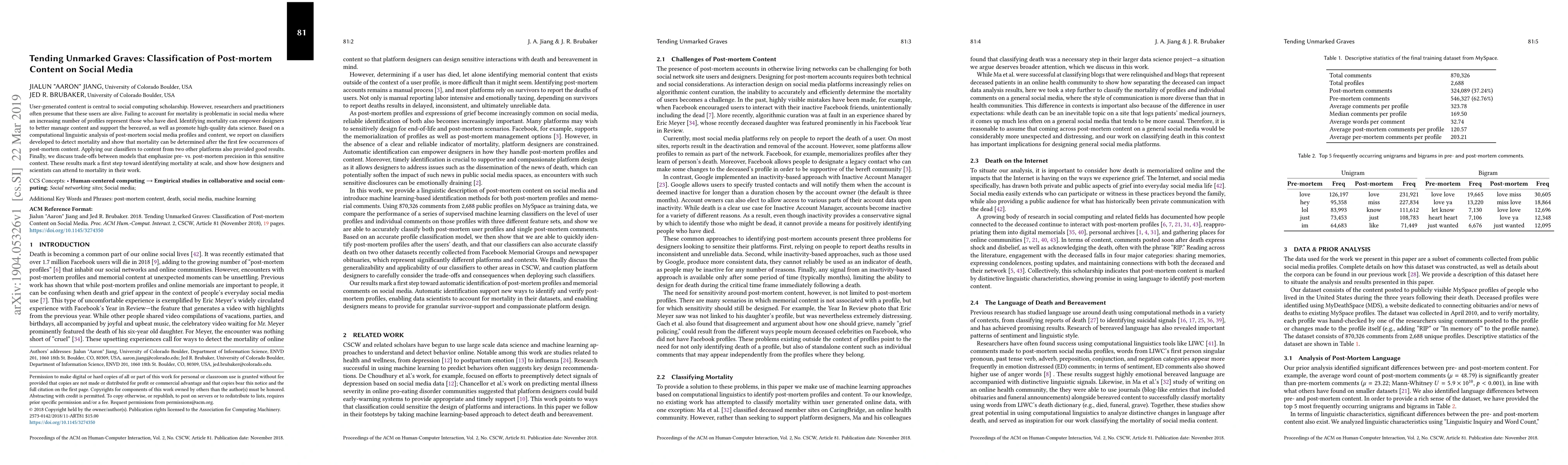 User-generated content is central to social computing scholarship. However, researchers and practitioners often presume that these users are alive. Failing to account for mortality is problematic in social media where an increasing number of profiles represent those who have died. Identifying mortality can empower designers to better manage content and support the bereaved, as well as promote high-quality data science. Based on a computational linguistic analysis of post-mortem social media profiles and content, we report on classifiers developed to detect mortality and show that mortality can be determined after the first few occurrences of post-mortem content. Applying our classifiers to content from two other platforms also provided good results. Finally, we discuss trade-offs between models that emphasize pre- vs. post-mortem precision in this sensitive context. These results mark a first step toward identifying mortality at scale, and show how designers and scientists can attend to mortality in their work.