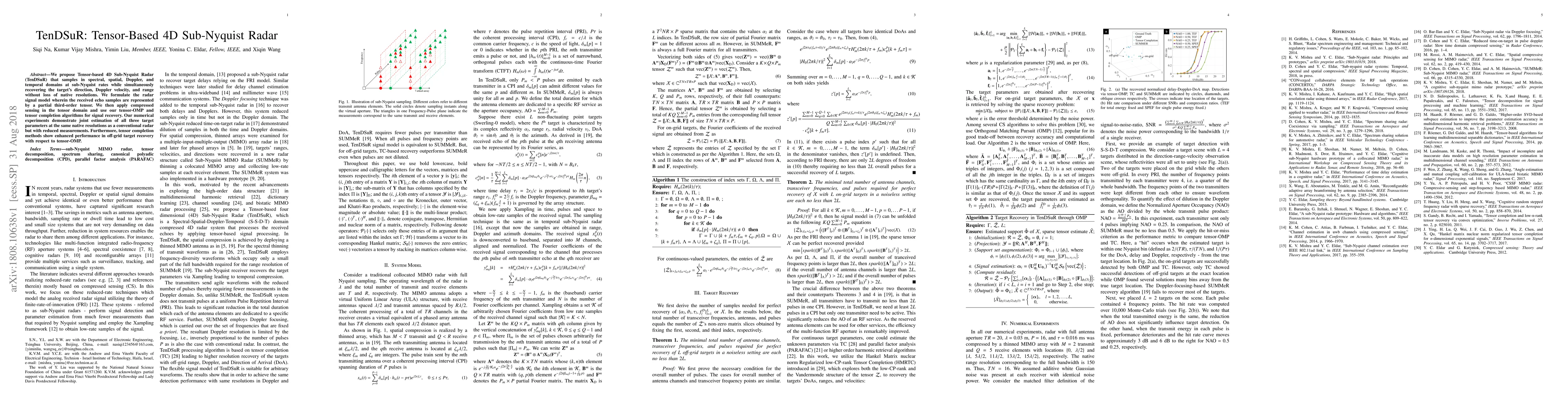 The TenDSuR method proposes a tensor-based approach to 4D Sub-Nyquist radar, enabling the recovery of target direction, Doppler velocity, and range at native resolutions with fewer measurements. It employs tensor completion and tensor-OMP algorithms for signal recovery, demonstrating superior off-grid target estimation.