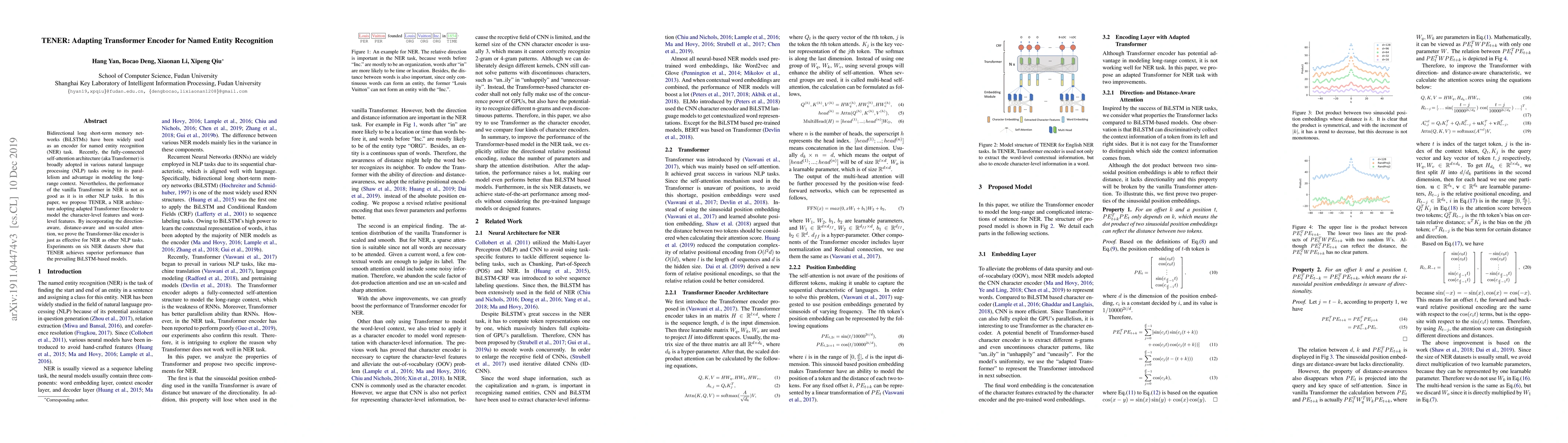 This paper proposes TENER, an architecture that adapts Transformer Encoder for Named Entity Recognition (NER) by modeling both character-level and word-level features. The authors demonstrate that the adapted Transformer-like encoder, with direction and relative distance aware attention, performs comparably to BiLSTMs in NER tasks.