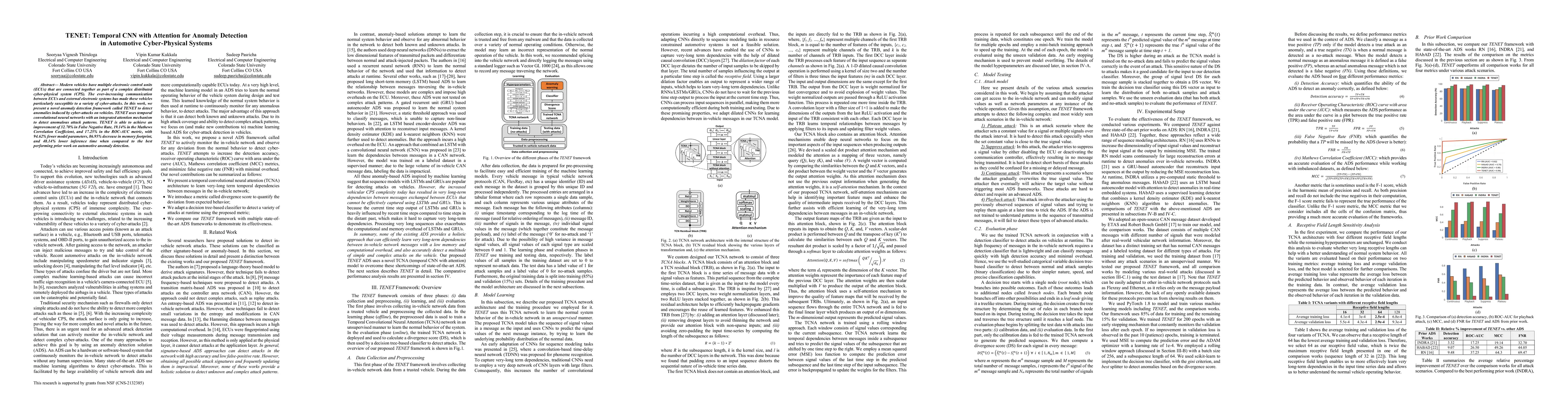 Modern vehicles have multiple electronic control units (ECUs) that are connected together as part of a complex distributed cyber-physical system (CPS). The ever-increasing communication between ECUs and external electronic systems has made these vehicles particularly susceptible to a variety of cyber-attacks. In this work, we present a novel anomaly detection framework called TENET to detect anomalies induced by cyber-attacks on vehicles. TENET uses temporal convolutional neural networks with an integrated attention mechanism to detect anomalous attack patterns. TENET is able to achieve an improvement of 32.70% in False Negative Rate, 19.14% in the Mathews Correlation Coefficient, and 17.25% in the ROC-AUC metric, with 94.62% fewer model parameters, 86.95% decrease in memory footprint, and 48.14% lower inference time when compared to the best performing prior work on automotive anomaly detection.