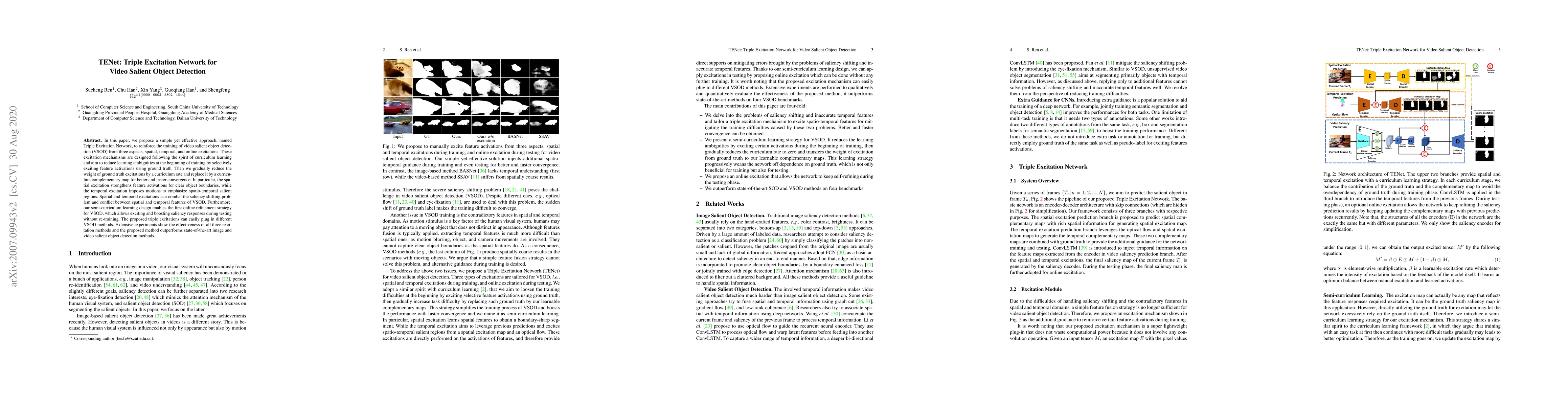 A novel triple-excitation network (Tenet) is proposed for video saliency detection, which combines convolutional neural networks with a spatial attention mechanism.