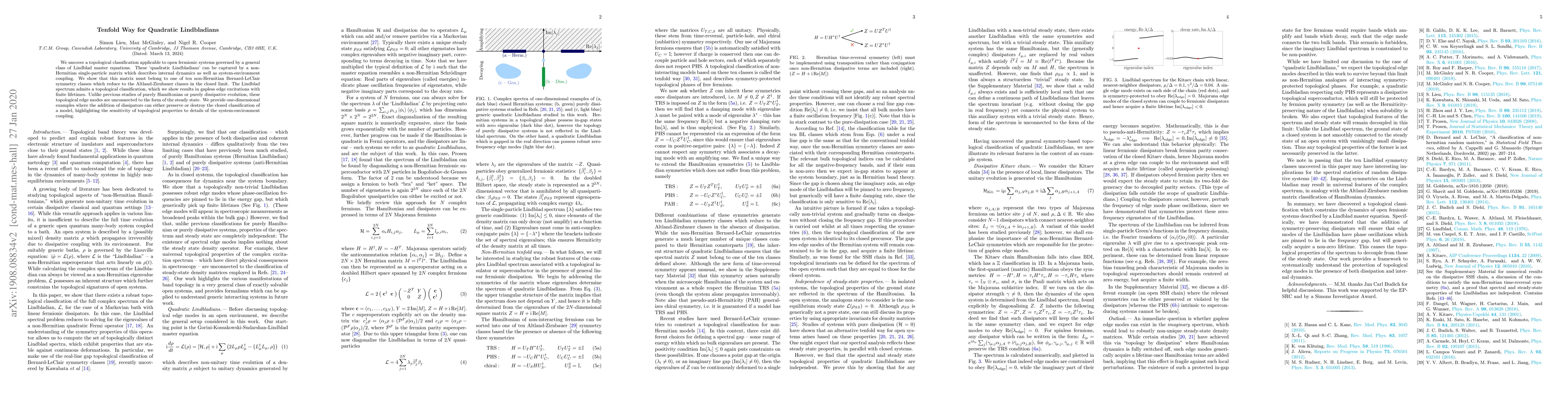 We uncover a topological classification applicable to open fermionic systems governed by a general class of Lindblad master equations. These `quadratic Lindbladians' can be captured by a non-Hermitian single-particle matrix which describes internal dynamics as well as system-environment coupling. We show that this matrix must belong to one of ten non-Hermitian Bernard-LeClair symmetry classes which reduce to the Altland-Zirnbauer classes in the closed limit. The Lindblad spectrum admits a topological classification, which we show results in gapless edge excitations with finite lifetimes. Unlike previous studies of purely Hamiltonian or purely dissipative evolution, these topological edge modes are unconnected to the form of the steady state. We provide one-dimensional examples where the addition of dissipators can either preserve or destroy the closed classification of a model, highlighting the sensitivity of topological properties to details of the system-environment coupling.