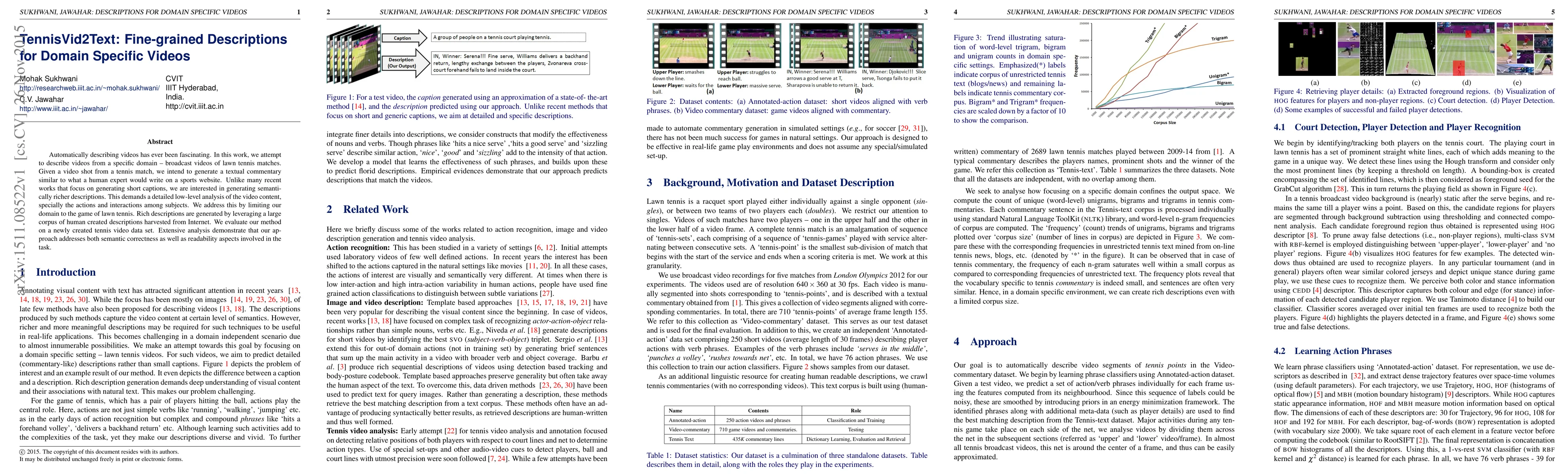 This paper introduces TennisVid2Text, a method for generating detailed textual commentaries from lawn tennis match videos. It leverages a corpus of human-created descriptions and evaluates on a new tennis video dataset, demonstrating semantic correctness and readability in the generated descriptions.