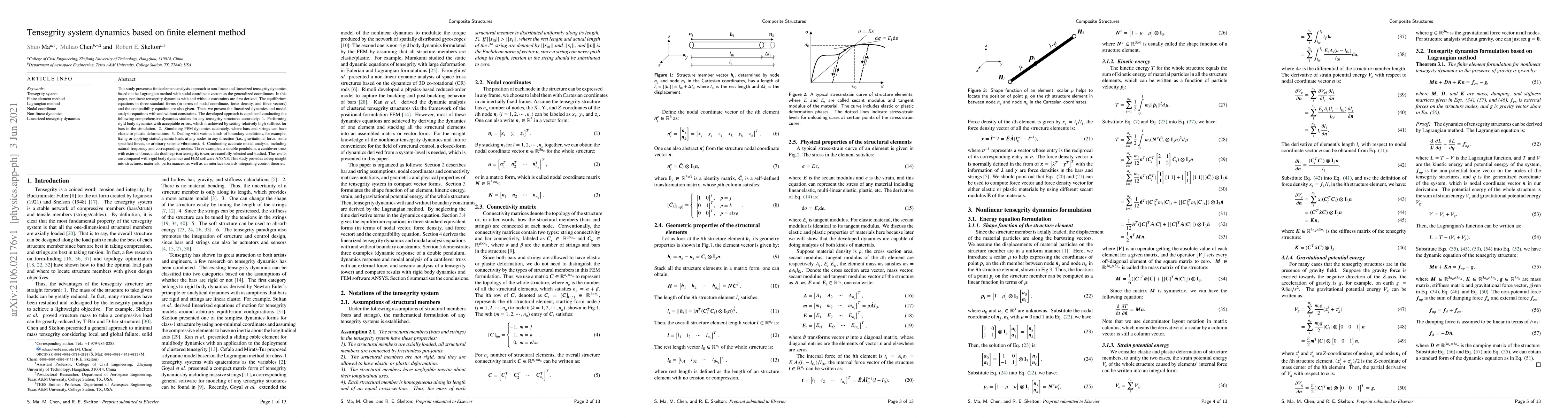 This paper develops a finite element method for analyzing both nonlinear and linearized dynamics of tensegrity systems using Lagrangian mechanics. It provides comprehensive dynamic studies, including rigid body and finite element dynamics, various boundary conditions, and accurate modal analysis, validated through examples compared with ANSYS software.