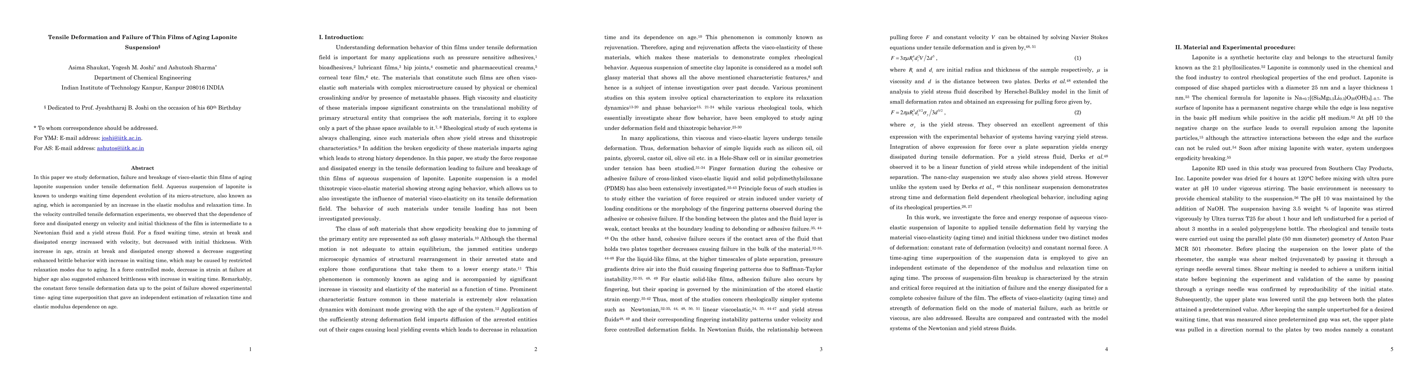 This study investigates the tensile deformation and failure behavior of aging laponite suspension thin films, finding that their mechanical properties transition between Newtonian fluid and yield stress fluid characteristics. With increased aging, the film exhibits enhanced brittleness, suggesting restricted relaxation modes due to micro-structural evolution.