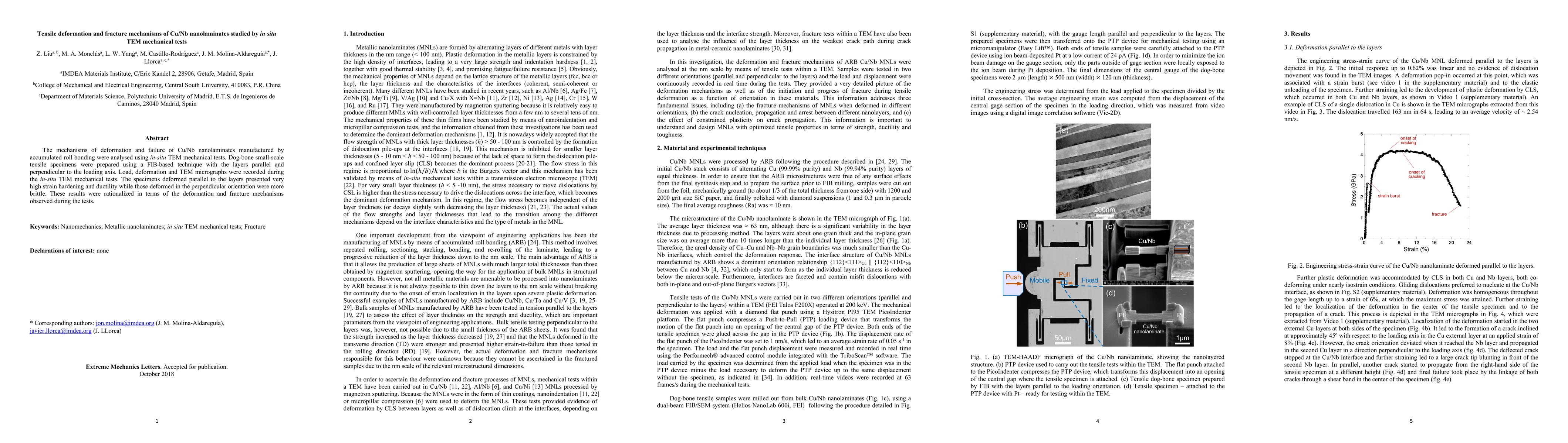 This study investigates the tensile deformation and fracture mechanisms of Cu/Nb nanolaminates using in-situ TEM mechanical tests. Results show high strain hardening and ductility in specimens oriented parallel to the layers, while perpendicular orientation led to more brittle failure, revealing distinct deformation and fracture behaviors.