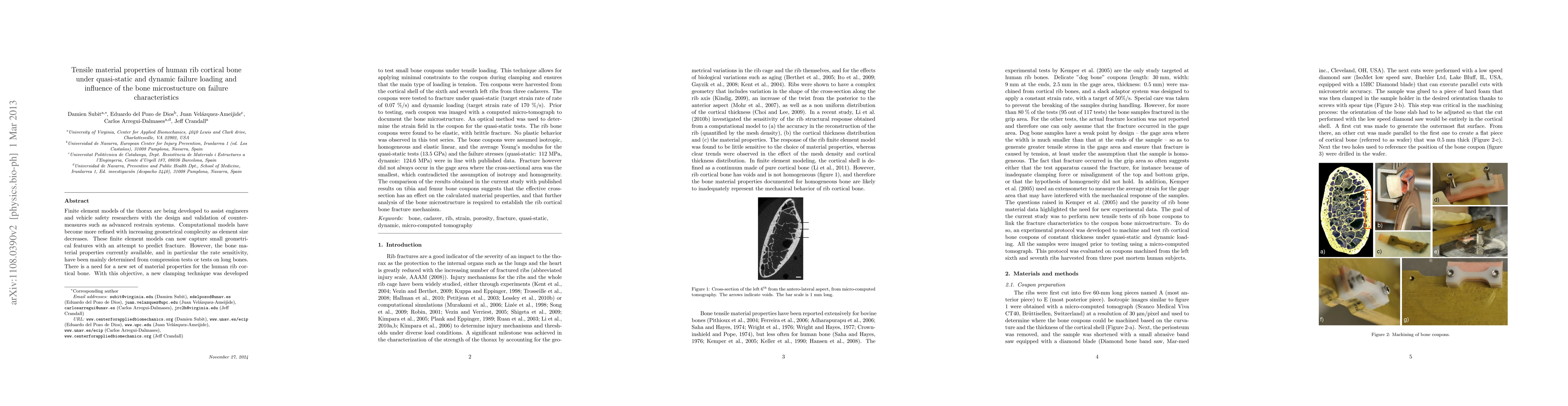 This study investigates the tensile material properties of human rib cortical bone under quasi-static and dynamic loading, revealing brittle fracture without plastic behavior. The research highlights discrepancies in fracture location and suggests that effective cross-section influences calculated material properties, indicating a need for tailored material data for rib bones.