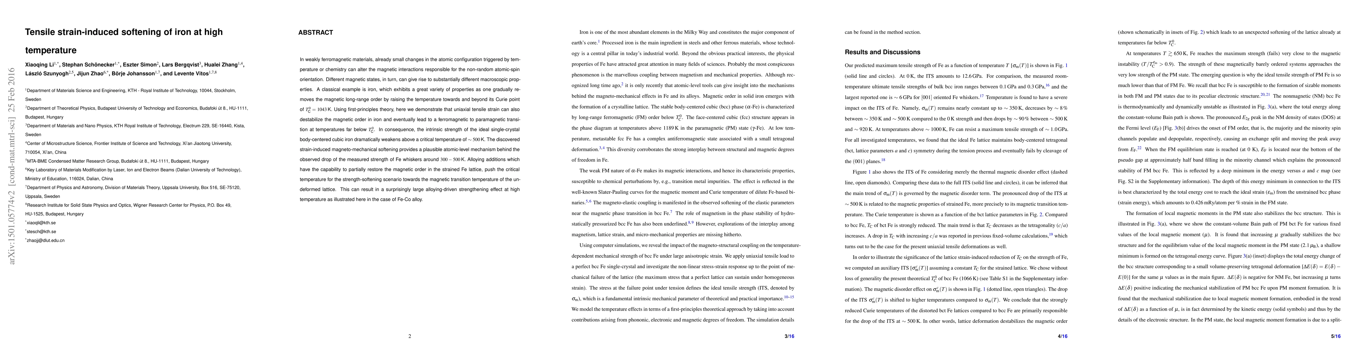 This study reveals that uniaxial tensile strain can destabilize the magnetic order in iron, leading to a transition from ferromagnetic to paramagnetic states at temperatures below the Curie point. This strain-induced magneto-mechanical softening significantly weakens the intrinsic strength of iron above a critical temperature of ~500 K, explaining the observed drop in strength of Fe whiskers.