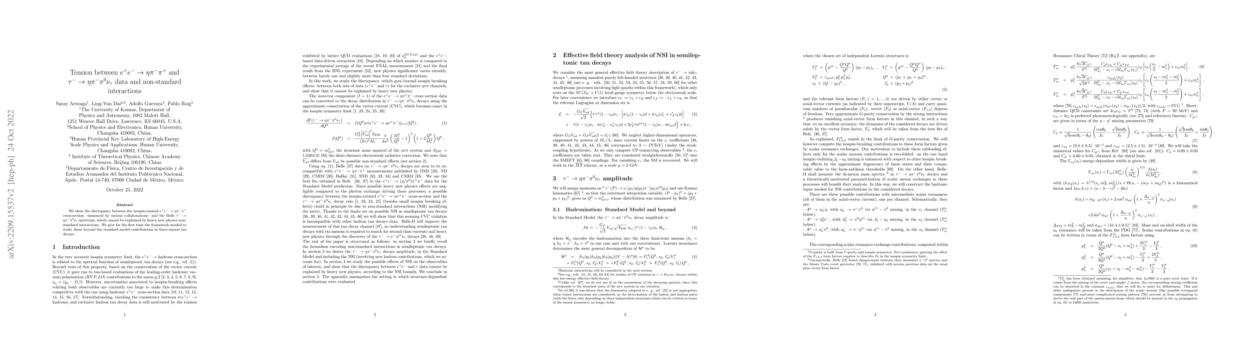 We show the discrepancy between the isospin-rotated $e^+e^-\to\eta\pi^-\pi^+$ cross-section -- measured by various collaborations -- and the Belle $\tau^-\to\eta\pi^-\pi^0\nu_\tau$ spectrum, which cannot be explained by heavy new physics non-standard interactions. We give for the first time the framework needed to study these beyond the standard model contributions in three-meson tau decays.