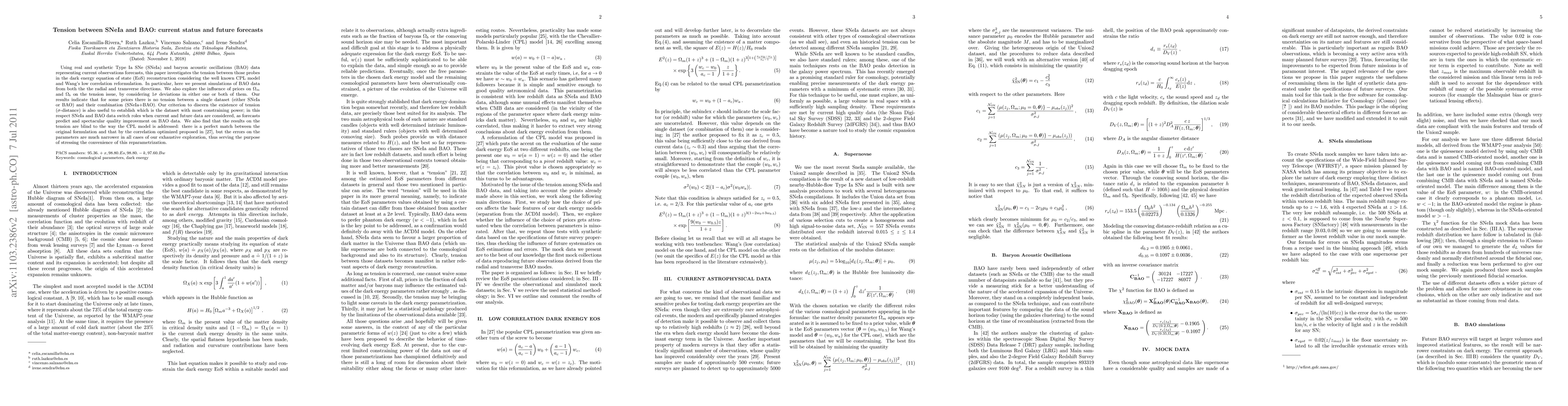 Using real and synthetic Type Ia SNe (SNeIa) and baryon acoustic oscillations (BAO) data representing current observations forecasts, this paper investigates the tension between those probes in the dark energy equation of state (EoS) reconstruction considering the well known CPL model and Wang's low correlation reformulation. In particular, here we present simulations of BAO data from both the the radial and transverse directions. We also explore the influence of priors on Omega_m and Omega_b on the tension issue, by considering 1-sigma deviations in either one or both of them. Our results indicate that for some priors there is no tension between a single dataset (either SNeIa or BAO) and their combination (SNeIa+BAO). Our criterion to discern the existence of tension (sigma-distance) is also useful to establish which is the dataset with most constraining power; in this respect SNeIa and BAO data switch roles when current and future data are considered, as forecasts predict and spectacular quality improvement on BAO data. We also find that the results on the tension are blind to the way the CPL model is addressed: there is a perfect match between the original formulation and that by the low correlation optimized, but the errors on the parameters are much narrower in all cases of our exhaustive exploration, thus serving the purpose of stressing the convenience of this reparametrization.