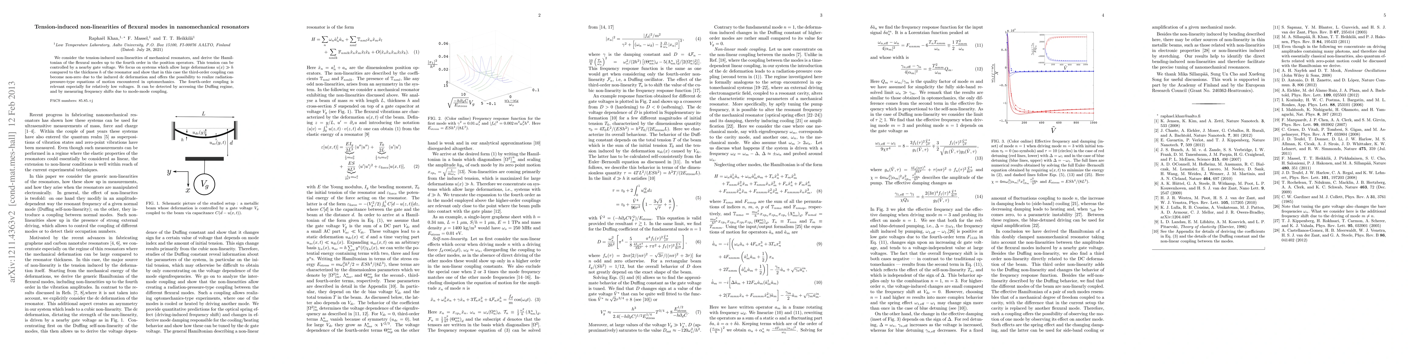 We consider the tension-induced non-linearities of mechanical resonators, and derive the Hamiltonian of the flexural modes up to the fourth order in the position operators. This tension can be controlled by a nearby gate voltage. We focus on systems which allow large deformations $u(x)\gg h$ compared to the thickness $h$ of the resonator and show that in this case the third-order coupling can become non-zero due to the induced dc deformation and offers the possibility to realize equations of motion encountered in optomechanics. The fourth-order coupling is relevant especially for relatively low voltages. It can be detected by accessing the Duffing regime, and by measuring frequency shifts due to mode-mode coupling.