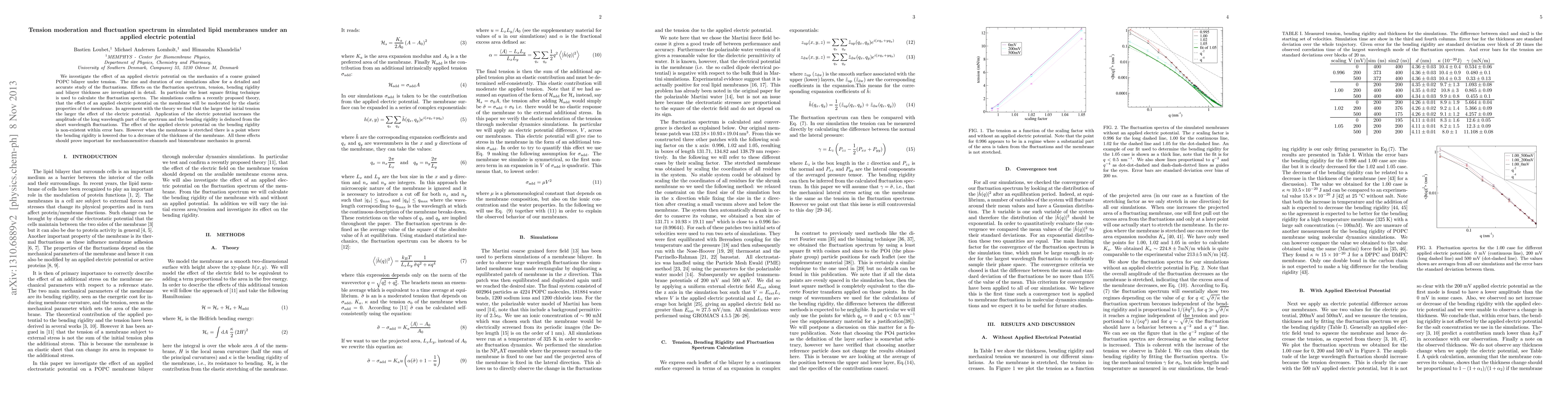 We investigate the effect of an applied electric potential on the mechanics of a coarse grained POPC bilayer under tension. The size and duration of our simulations allow for a detailed and accurate study of the fluctuations. Effects on the fluctuation spectrum, tension, bending rigidity, and bilayer thickness are investigated in detail. In particular, the least square fitting technique is used to calculate the fluctuation spectra. The simulations confirm a recently proposed theory that the effect of an applied electric potential on the membrane will be moderated by the elastic properties of the membrane. In agreement with the theory, we find that the larger the initial tension the larger the effect of the electric potential. Application of the electric potential increases the amplitude of the long wavelength part of the spectrum and the bending rigidity is deduced from the short wavelength fluctuations. The effect of the applied electric potential on the bending rigidity is non-existent within error bars. However, when the membrane is stretched there is a point where the bending rigidity is lowered due to a decrease of the thickness of the membrane. All these effects should prove important for mechanosensitive channels and biomembrane mechanics in general.