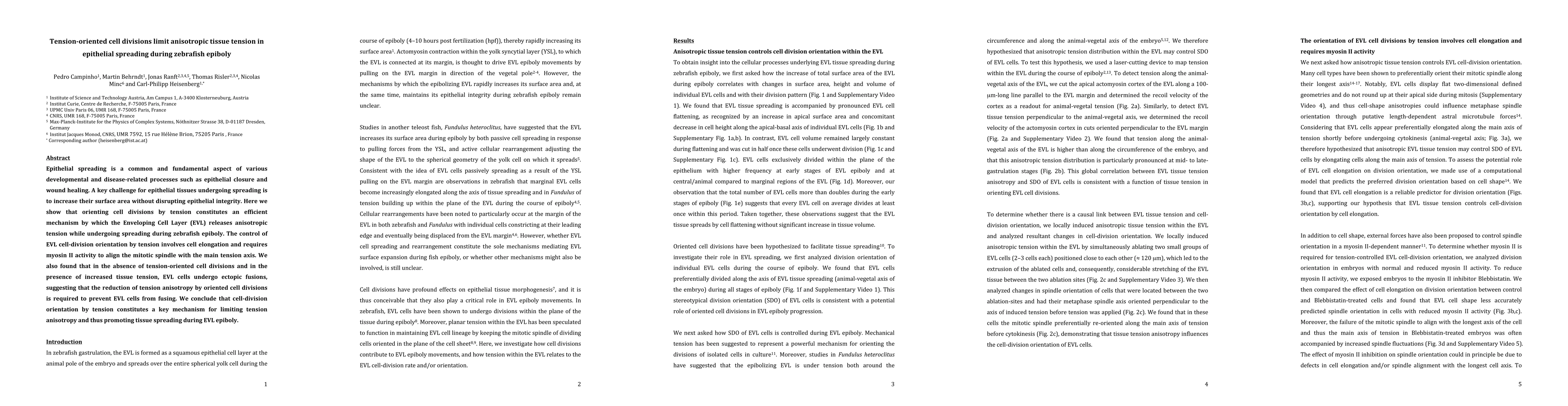 This study reveals that tension-oriented cell divisions in the Enveloping Cell Layer (EVL) of zebrafish during epiboly efficiently limit anisotropic tension, ensuring epithelial integrity while spreading. The alignment of mitotic spindles with the main tension axis, facilitated by myosin II activity, prevents cell fusions and maintains tissue tension anisotropy.