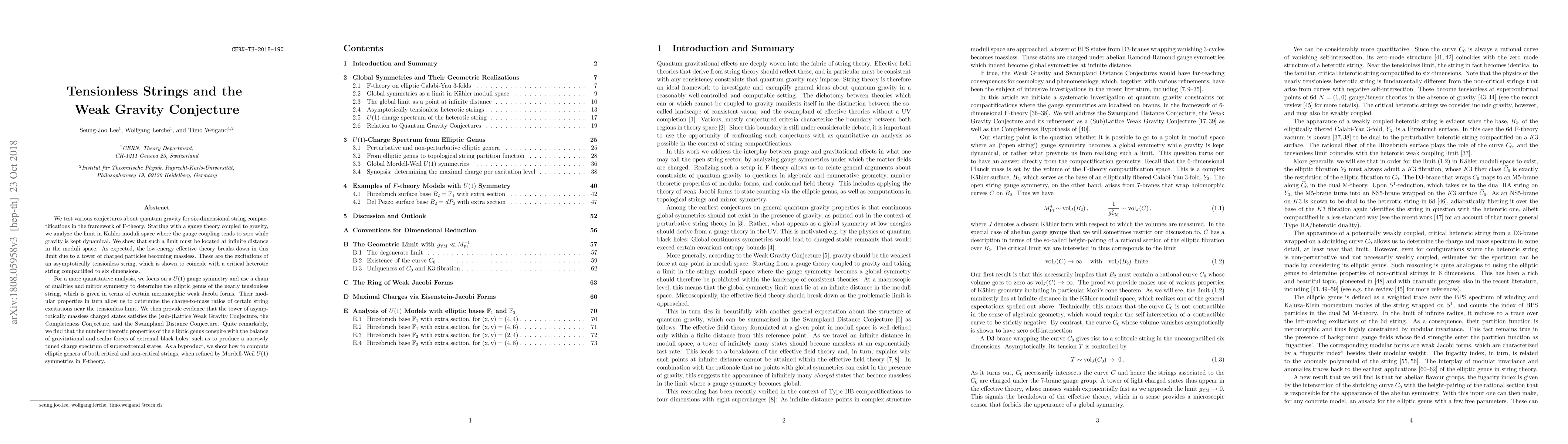 We test various conjectures about quantum gravity for six-dimensional string compactifications in the framework of F-theory. Starting with a gauge theory coupled to gravity, we analyze the limit in K\"ahler moduli space where the gauge coupling tends to zero while gravity is kept dynamical. We show that such a limit must be located at infinite distance in the moduli space. As expected, the low-energy effective theory breaks down in this limit due to a tower of charged particles becoming massless. These are the excitations of an asymptotically tensionless string, which is shown to coincide with a critical heterotic string compactified to six dimensions. For a more quantitative analysis, we focus on a $U(1)$ gauge symmetry and use a chain of dualities and mirror symmetry to determine the elliptic genus of the nearly tensionless string, which is given in terms of certain meromorphic weak Jacobi forms. Their modular properties in turn allow us to determine the mass-to-charge ratios of certain string excitations near the tensionless limit. We then provide evidence that the tower of asymptotically massless charged states satisfies the (sub-)Lattice Weak Gravity Conjecture, the Completeness Conjecture, and the Swampland Distance Conjecture. Quite remarkably, we find that the number theoretic properties of the elliptic genus conspire with the balance of gravitational and scalar forces of extremal black holes, such as to produce a narrowly tuned charge spectrum of superextremal states. As a byproduct, we show how to compute elliptic genera of both critical and non-critical strings, when refined by Mordell-Weil $U(1)$ symmetries in F-theory.
