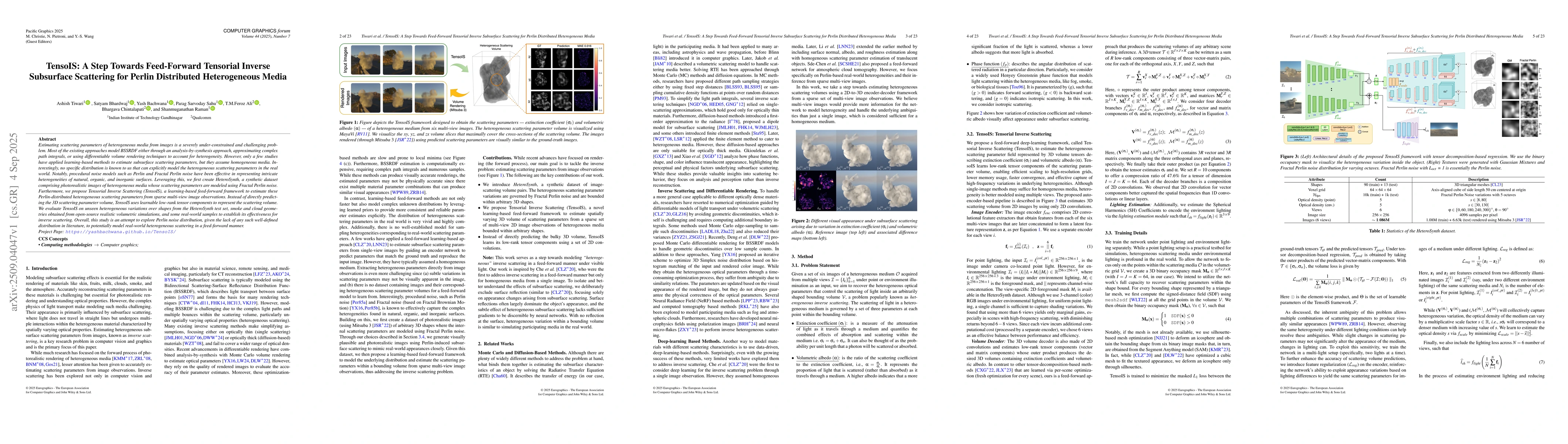 Estimating scattering parameters of heterogeneous media from images is a severely under-constrained and challenging problem. Most of the existing approaches model BSSRDF either through an analysis-by-synthesis approach, approximating complex path integrals, or using differentiable volume rendering techniques to account for heterogeneity. However, only a few studies have applied learning-based methods to estimate subsurface scattering parameters, but they assume homogeneous media. Interestingly, no specific distribution is known to us that can explicitly model the heterogeneous scattering parameters in the real world. Notably, procedural noise models such as Perlin and Fractal Perlin noise have been effective in representing intricate heterogeneities of natural, organic, and inorganic surfaces. Leveraging this, we first create HeteroSynth, a synthetic dataset comprising photorealistic images of heterogeneous media whose scattering parameters are modeled using Fractal Perlin noise. Furthermore, we propose Tensorial Inverse Scattering (TensoIS), a learning-based feed-forward framework to estimate these Perlin-distributed heterogeneous scattering parameters from sparse multi-view image observations. Instead of directly predicting the 3D scattering parameter volume, TensoIS uses learnable low-rank tensor components to represent the scattering volume. We evaluate TensoIS on unseen heterogeneous variations over shapes from the HeteroSynth test set, smoke and cloud geometries obtained from open-source realistic volumetric simulations, and some real-world samples to establish its effectiveness for inverse scattering. Overall, this study is an attempt to explore Perlin noise distribution, given the lack of any such well-defined distribution in literature, to potentially model real-world heterogeneous scattering in a feed-forward manner.