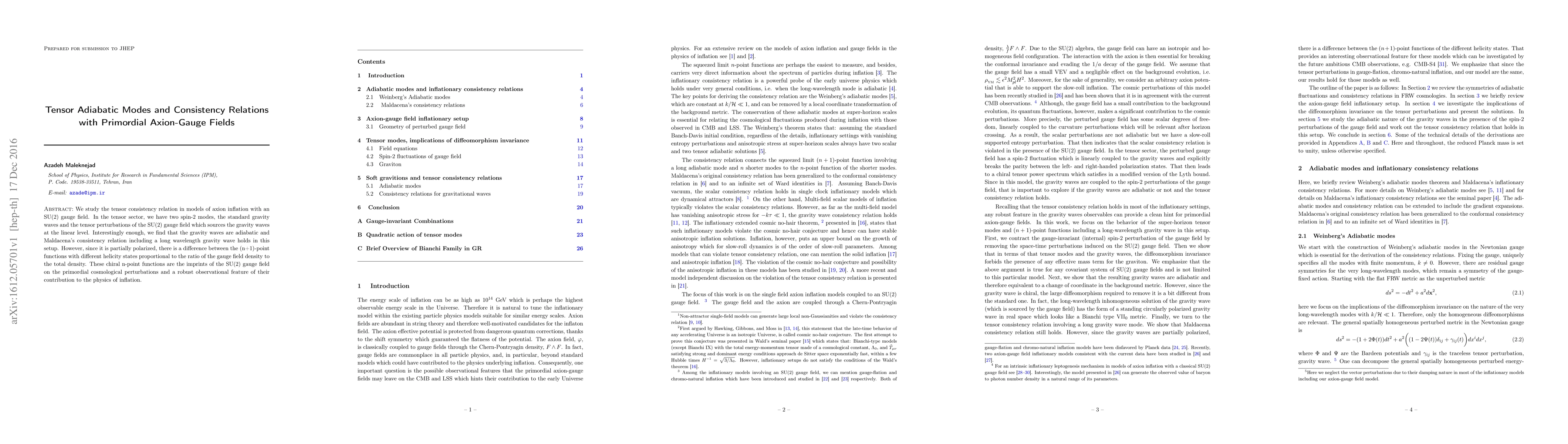 This paper investigates the tensor consistency relation in axion inflation models with an SU(2) gauge field, revealing that gravity waves are adiabatic and adhere to Maldacena's consistency relation. It also highlights the unique imprints of the SU(2) gauge field on primordial cosmological perturbations, evidenced by chiral n-point functions.