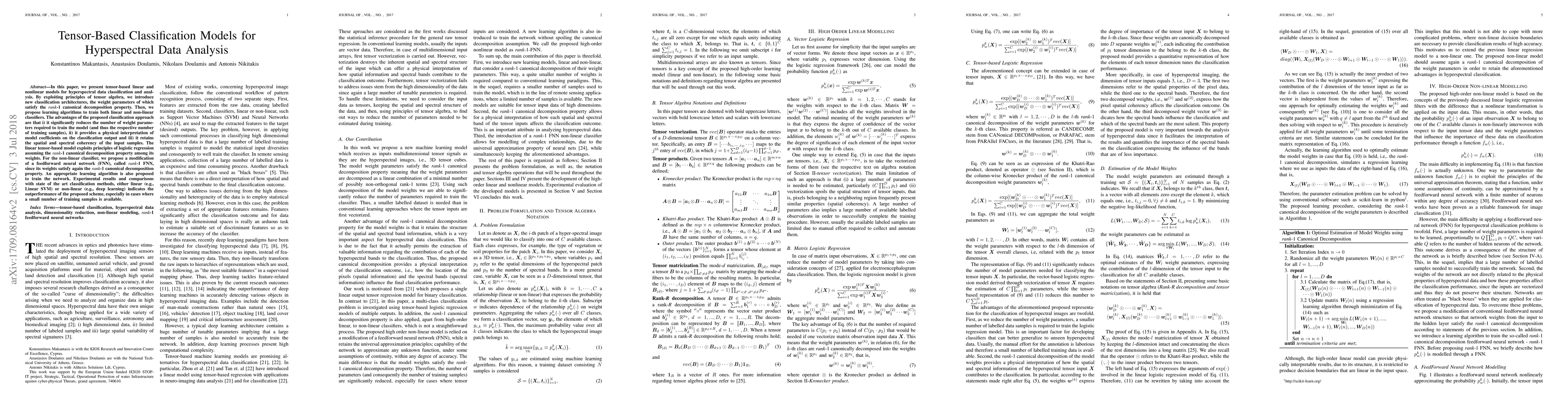 In this work, we present tensor-based linear and nonlinear models for hyperspectral data classification and analysis. By exploiting principles of tensor algebra, we introduce new classification architectures, the weight parameters of which satisfies the {\it rank}-1 canonical decomposition property. Then, we introduce learning algorithms to train both the linear and the non-linear classifier in a way to i) to minimize the error over the training samples and ii) the weight coefficients satisfies the {\it rank}-1 canonical decomposition property. The advantages of the proposed classification model is that i) it reduces the number of parameters required and thus reduces the respective number of training samples required to properly train the model, ii) it provides a physical interpretation regarding the model coefficients on the classification output and iii) it retains the spatial and spectral coherency of the input samples. To address issues related with linear classification, characterizing by low capacity, since it can produce rules that are linear in the input space, we introduce non-linear classification models based on a modification of a feedforward neural network. We call the proposed architecture {\it rank}-1 Feedfoward Neural Network (FNN), since their weights satisfy the {\it rank}-1 caconical decomposition property. Appropriate learning algorithms are also proposed to train the network. Experimental results and comparisons with state of the art classification methods, either linear (e.g., SVM) and non-linear (e.g., deep learning) indicates the outperformance of the proposed scheme, especially in cases where a small number of training samples are available. Furthermore, the proposed tensor-based classfiers are evaluated against their capabilities in dimensionality reduction.