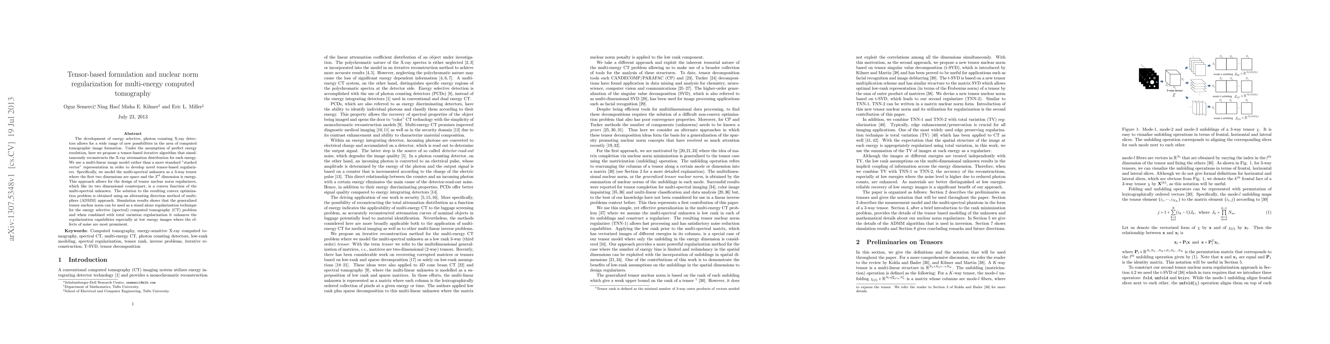 The development of energy selective, photon counting X-ray detectors allows for a wide range of new possibilities in the area of computed tomographic image formation. Under the assumption of perfect energy resolution, here we propose a tensor-based iterative algorithm that simultaneously reconstructs the X-ray attenuation distribution for each energy. We use a multi-linear image model rather than a more standard "stacked vector" representation in order to develop novel tensor-based regularizers. Specifically, we model the multi-spectral unknown as a 3-way tensor where the first two dimensions are space and the third dimension is energy. This approach allows for the design of tensor nuclear norm regularizers, which like its two dimensional counterpart, is a convex function of the multi-spectral unknown. The solution to the resulting convex optimization problem is obtained using an alternating direction method of multipliers (ADMM) approach. Simulation results shows that the generalized tensor nuclear norm can be used as a stand alone regularization technique for the energy selective (spectral) computed tomography (CT) problem and when combined with total variation regularization it enhances the regularization capabilities especially at low energy images where the effects of noise are most prominent.